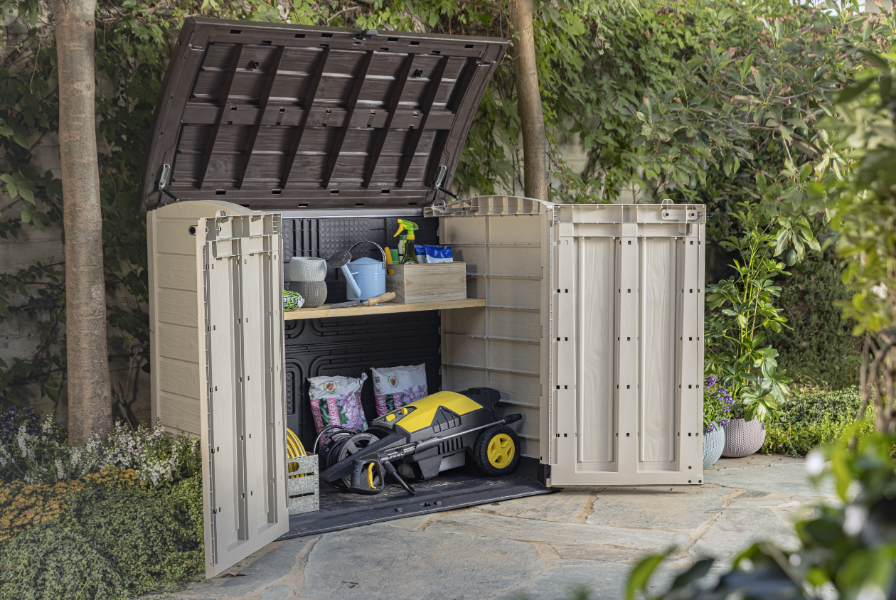 Il box porta attrezzi Store-It-Out ARC di Keter è una soluzione salvaspazio perfetta per riporre bidoni da 240 L, attrezzi da giardino, cuscini da esterno o piccoli mobili.