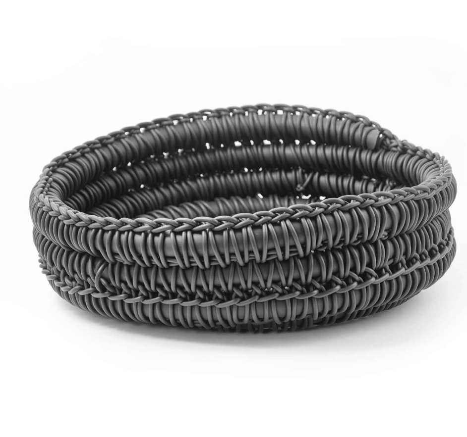 Il Cesto Nido è realizzato a mano a maglia con doppio filo di neoprene di diverso spessore, che dona al pezzo una struttura solida ma flessibile.