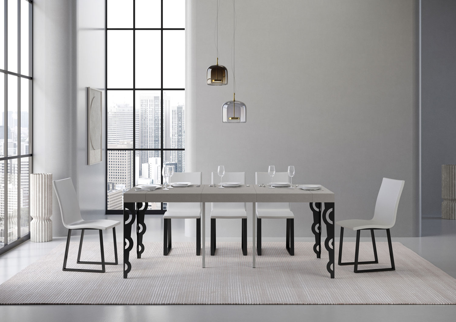 Consolle allungabile Karamay Premium, versatile e robusta, un complemento perfetto per ogni ambiente della casa: ingresso, cucina, sala da pranzo, soggiorno o corridoio. La consolle allungabile Karamay Premium può essere facilmente trasformata in un ampio tavolo da pranzo lungo fino a 300 cm, in grado di ospitare 14 persone. Realizzata con pannelli in nobilitato, gambe in ferro. Il sistema di allunghe con guide telescopiche in alluminio e il sostegno centrale in dotazione rendono la consolle stabile e robusta. Una volta che la consolle è chiusa, le allunghe devono essere riposte altrove. Prodotto Itamoby Made in Italy Dimensioni: Consolle chiusa: L.90 P.40 H.77 cm Lunghezza con 1 allunga: 92 cm Lunghezza con 2 allunghe: 144 cm Lunghezza con 3 allunghe: 196 cm Lunghezza con 4 allunghe: 248 cm Lunghezza con 5 allunghe: 300 cm