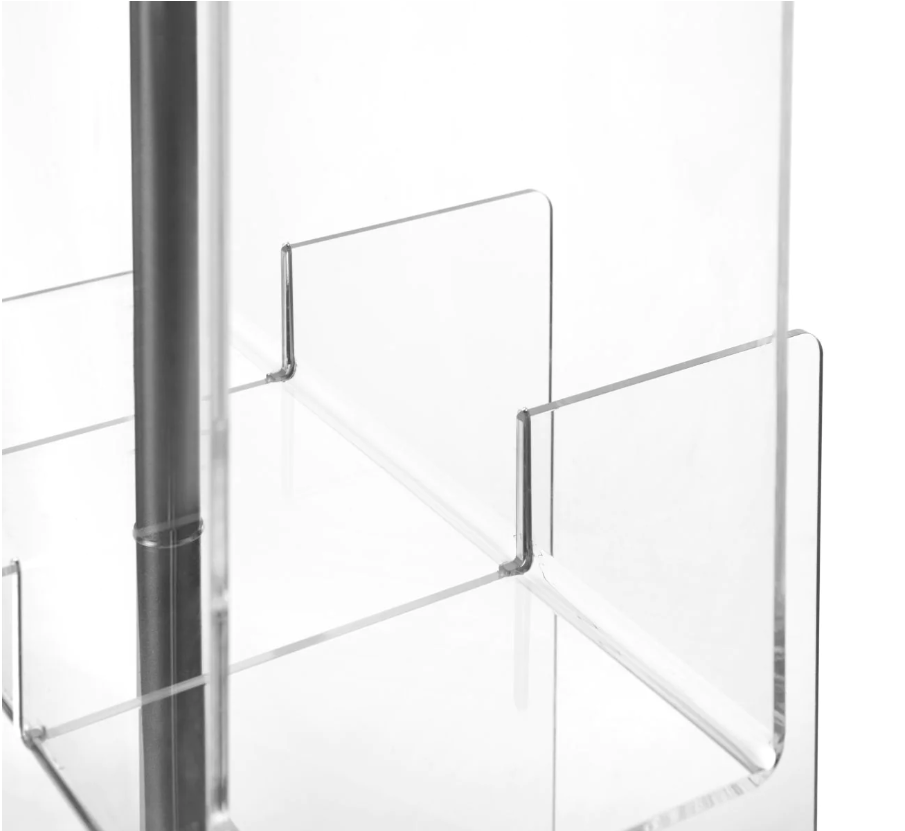 Realizzato in metacrilato nei colori trasparente, satinato, marrone fumè, grigio fumè e rosso.