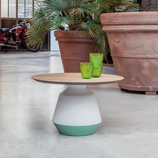 Konferenční stolek s keramickou podnoží a deskou z MDF potaženého dřeva.