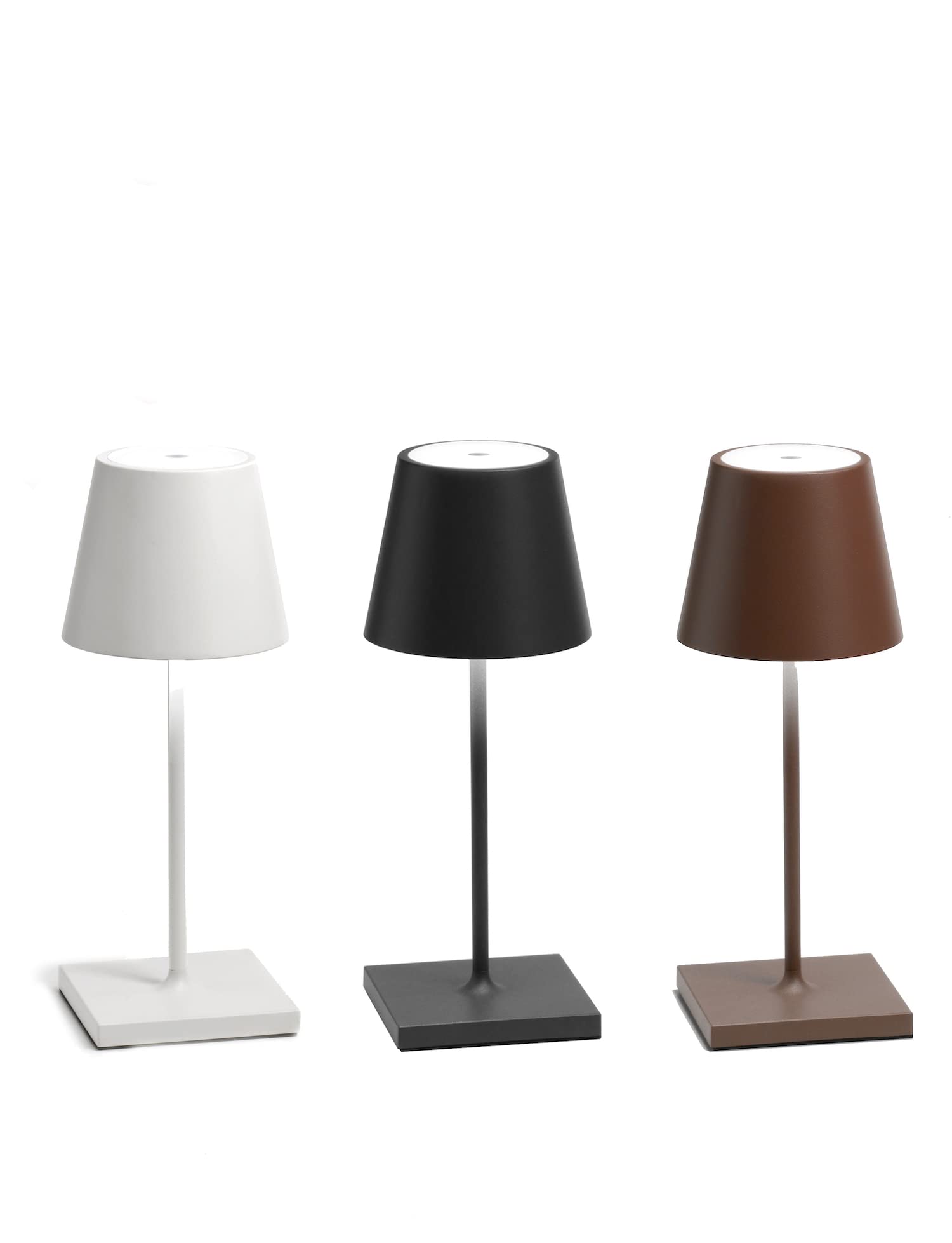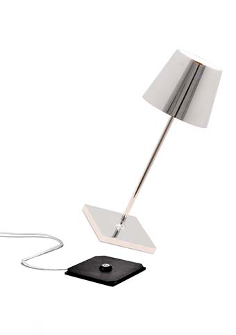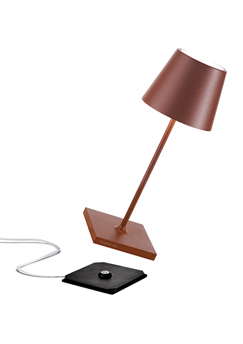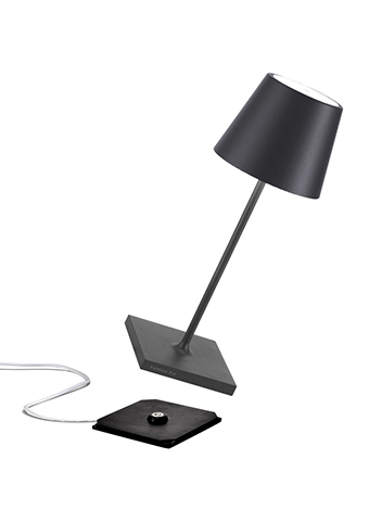 Dobíjecí stolní lampa, včetně kontaktní nabíjecí základny, s lakovaným hliníkovým tělem, polykarbonátovým difuzorem a LED světelným zdrojem