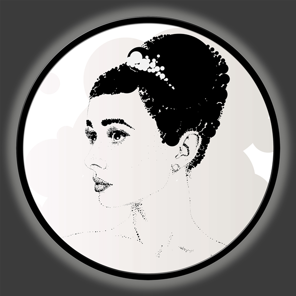 Kulatý panel z dřevovláknitých vláken, potažený polyesterovým plátnem s vysokým rozlišením a s matně lakovaným kovovým rámem.