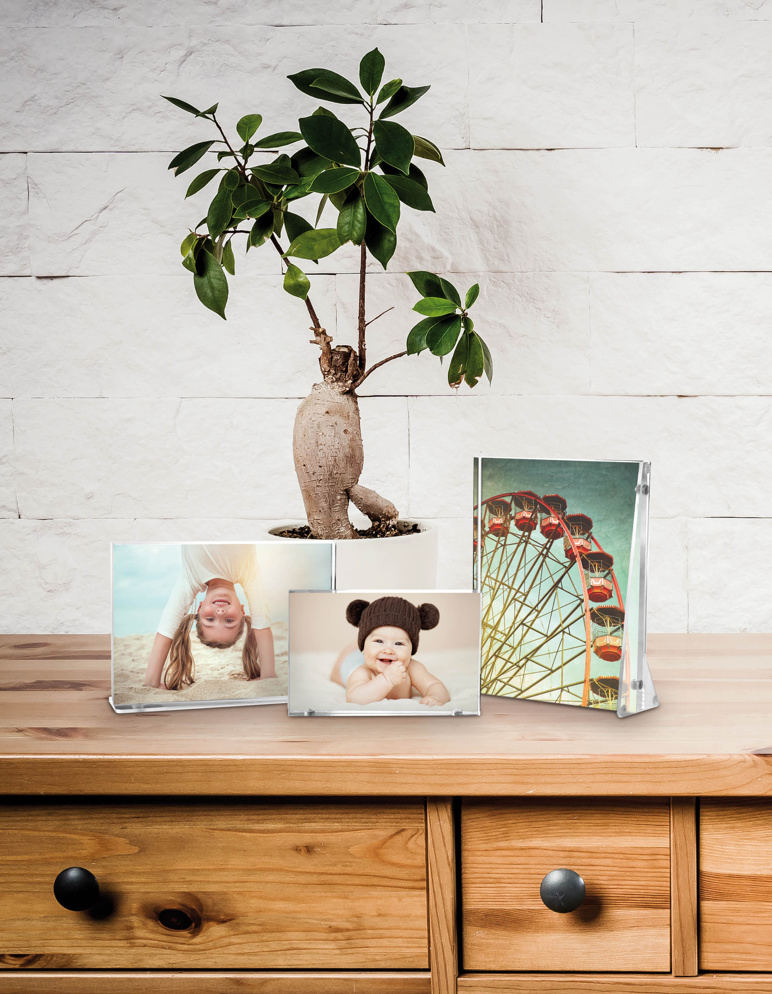 Průhledný akrylový fotorámeček pro horizontální i vertikální uchycení.