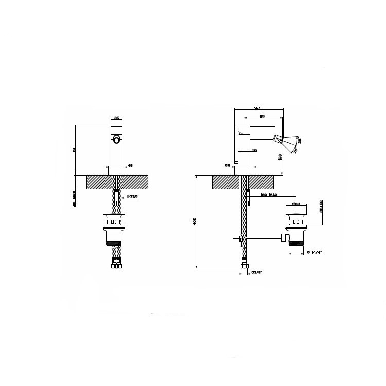Páková bidetová baterie, odpad 1 1/4" a flexibilní připojovací hadice s připojením 3/8".