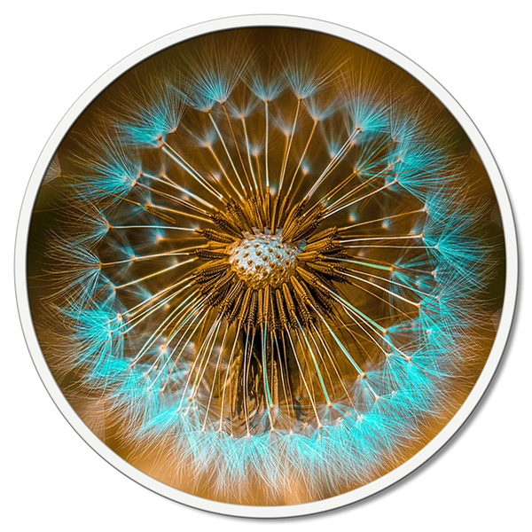 Kulatý panel z dřevěných vláken potažený čistým bavlněným plátnem s potiskem ve vysokém rozlišení a s matně lakovaným kovovým rámem.