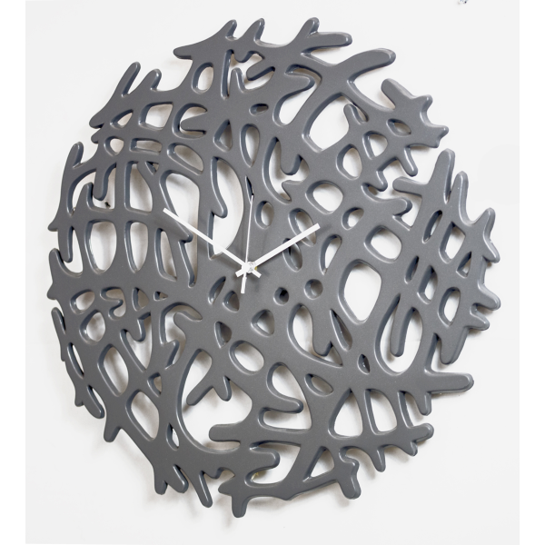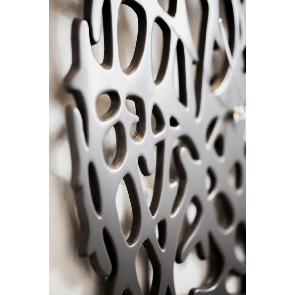 Hodiny s perforovaným rámem z kompozitní keramiky. Povrchová úprava v křemenně šedém laku a chromované ručičky.