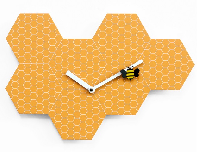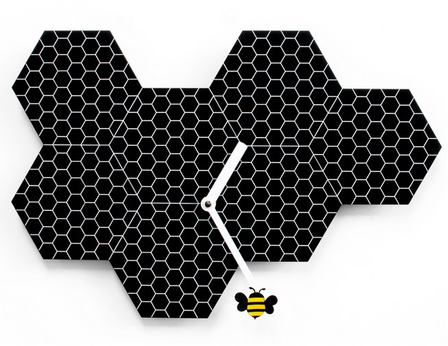 Zábavné a barevné nástěnné hodiny, ideální do dětských pokojů nebo pro dodání nádechu veselosti a bezstarostnosti do jakéhokoli prostoru. Hodiny Time2bee, vyrobené z oceli, evokují tvar a grafiku včelích úlů se žlutočernou včelou visící z minutové ručičky, která se pokojně pohybuje mezi buňkami. Quartzový strojek napájený z baterie.