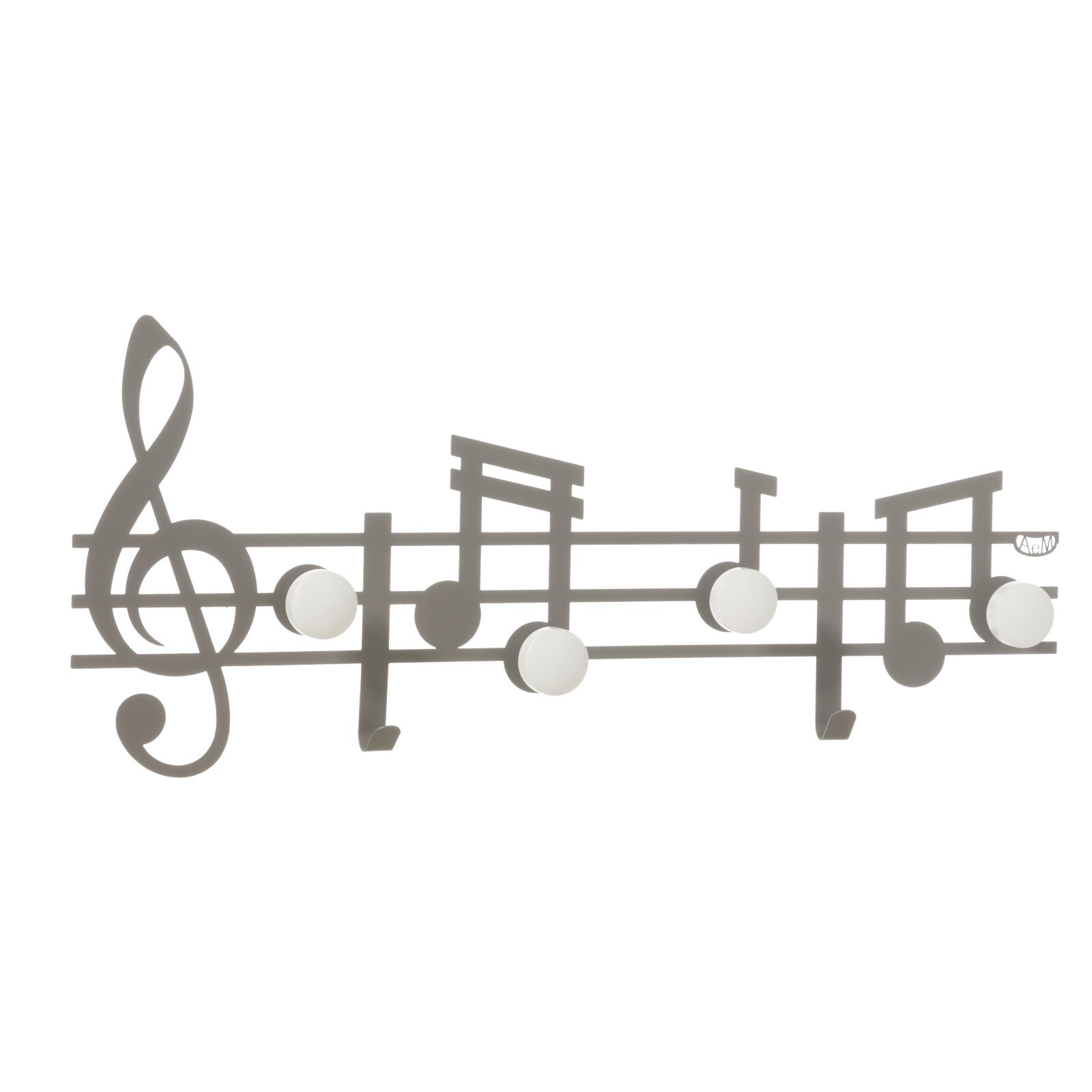Věšák na kabáty se šesti háčky (čtyři z nich jsou bílé a umístěné na hlavičkách not) dostupný ve třech barevných variantách.