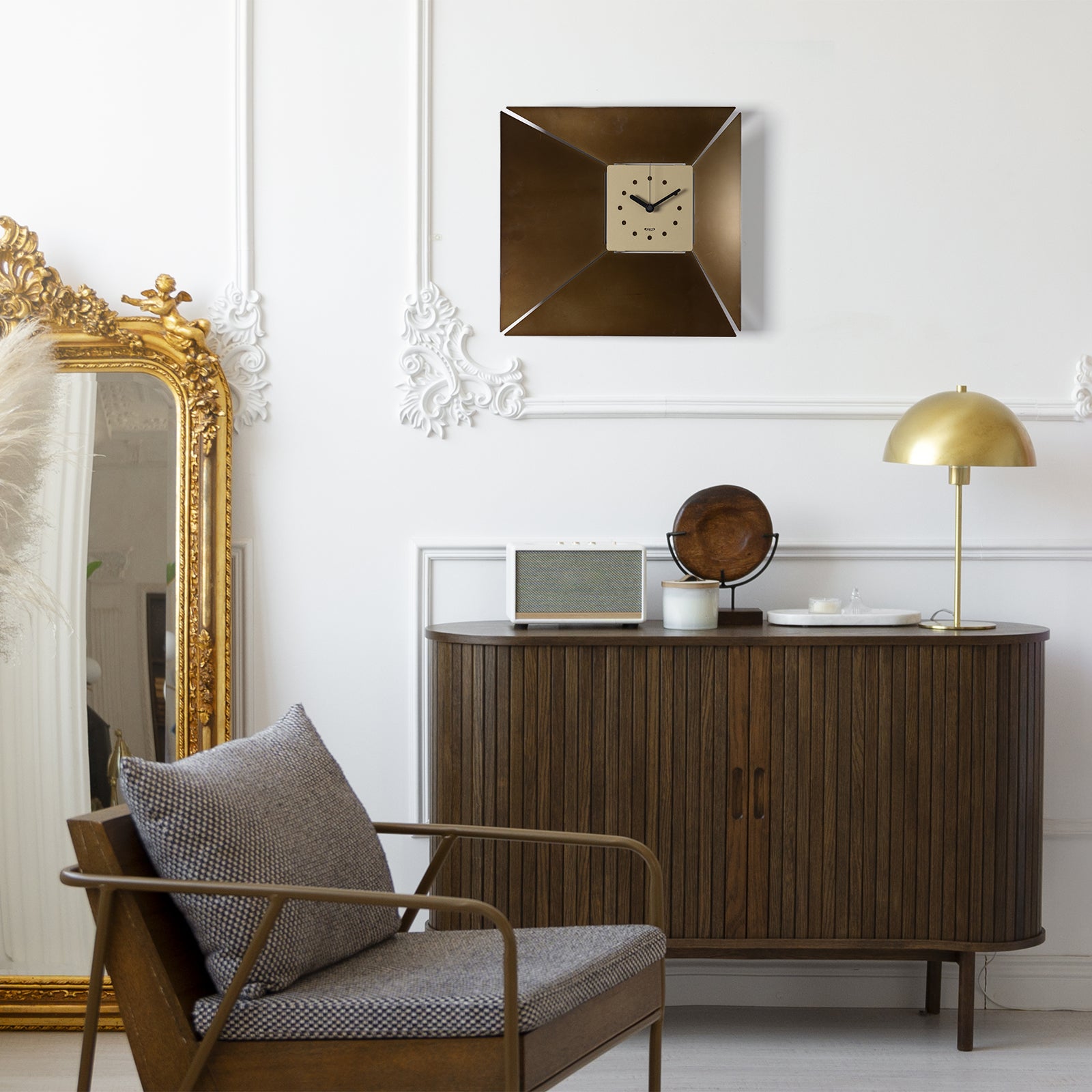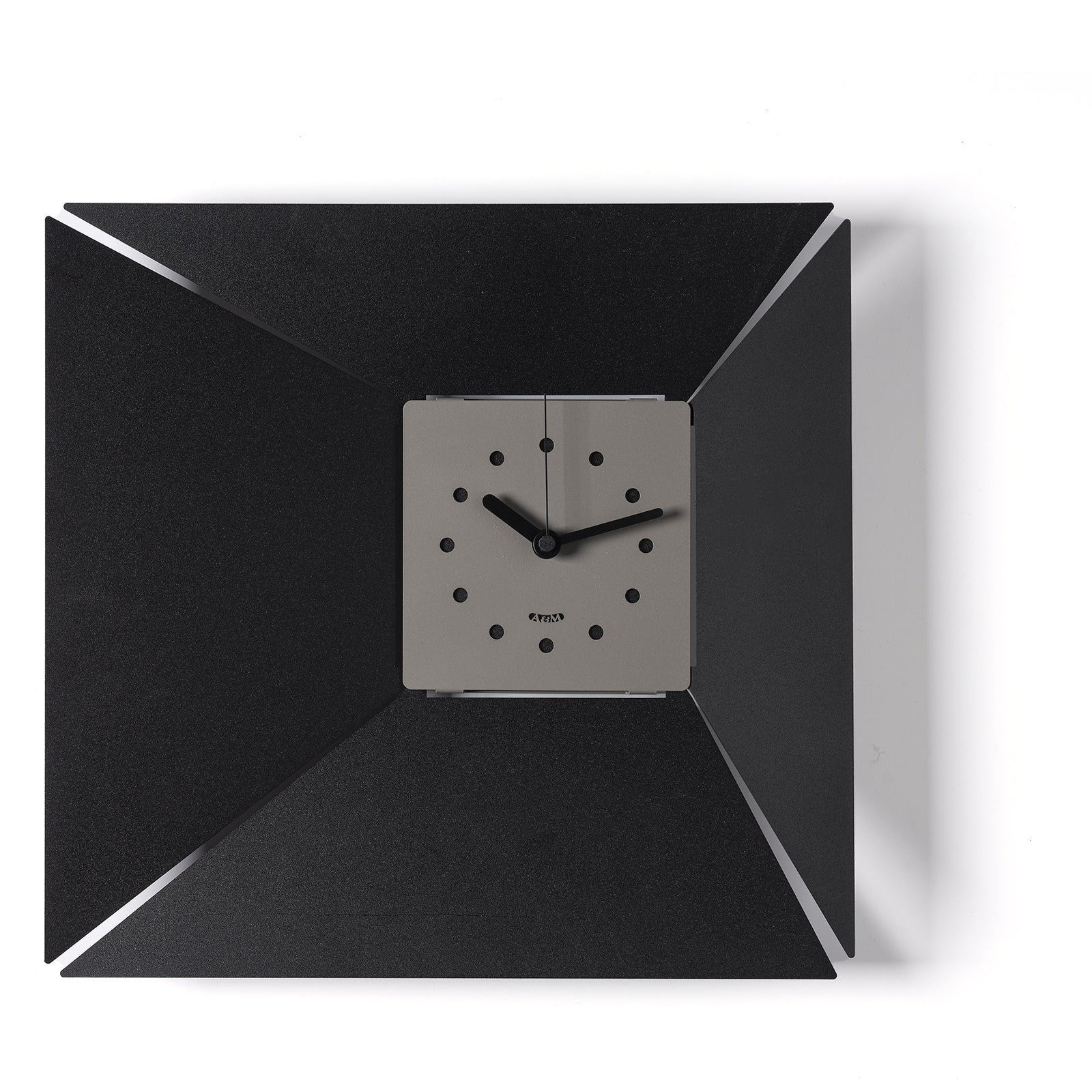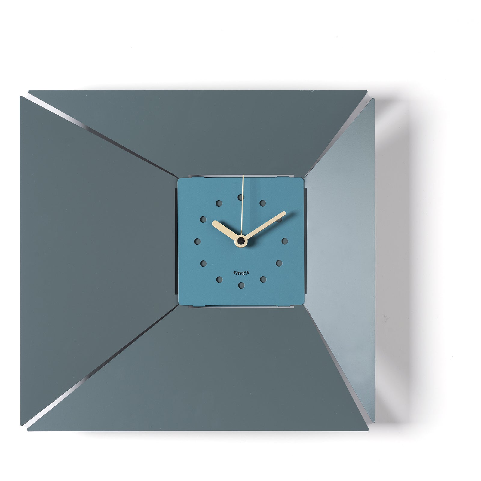 Struktura je čtvercová o rozměrech 42 x 5 x 40 cm na výšku, ale jedinečnou ji činí řemeslné zpracování rohů: perforované a zkosené dovnitř přitahují pozornost k menšímu ciferníku, který je také čtvercový a mimo střed. Tento detail vytváří jemný, téměř trychtýřovitý perspektivní efekt, zdůrazněný 5cm hloubkou celé konstrukce. Ciferník je i přes svou jednoduchost funkční díky přítomnosti perforovaných kruhů, které nahrazují číslice a umožňují jasné odečítání času.