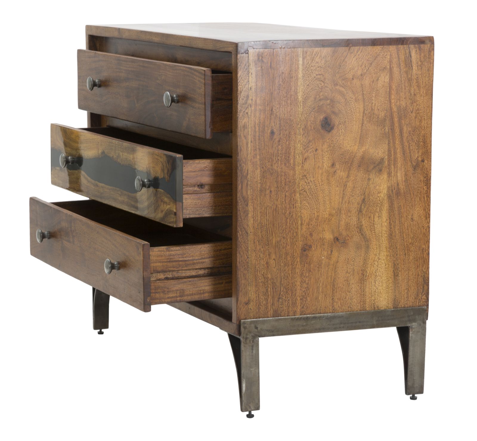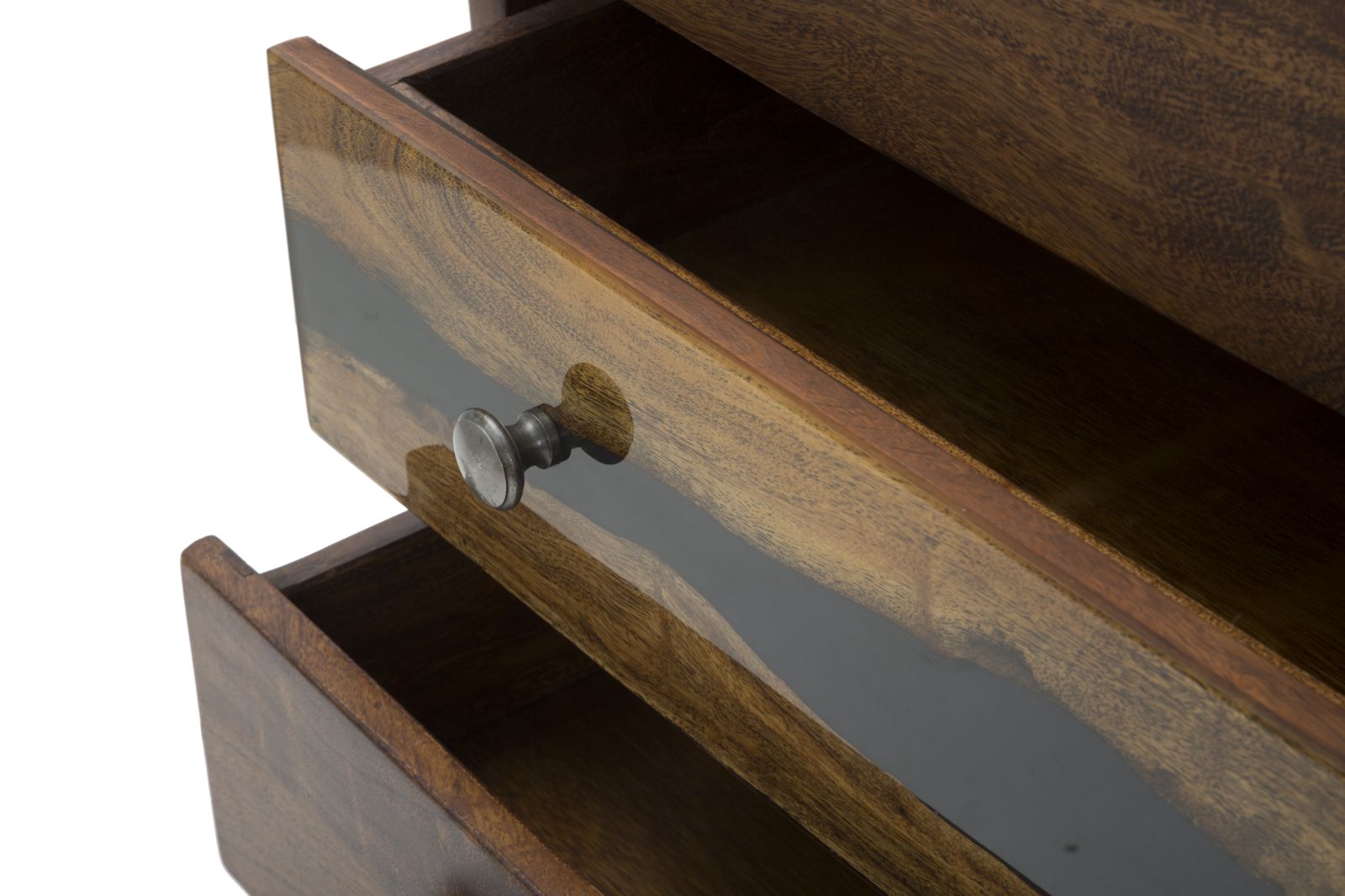 Elegantní komoda z masivního akáciového dřeva se 3 zásuvkami. Unikátní detaily z pryskyřice na zásuvkách dodávají tomuto mimořádně elegantnímu a klasickému kusu nábytku nádech barvy a modernity.