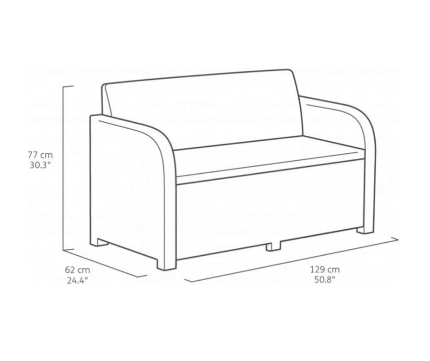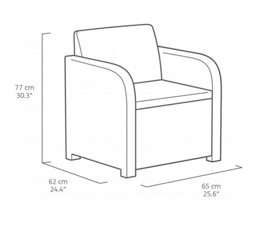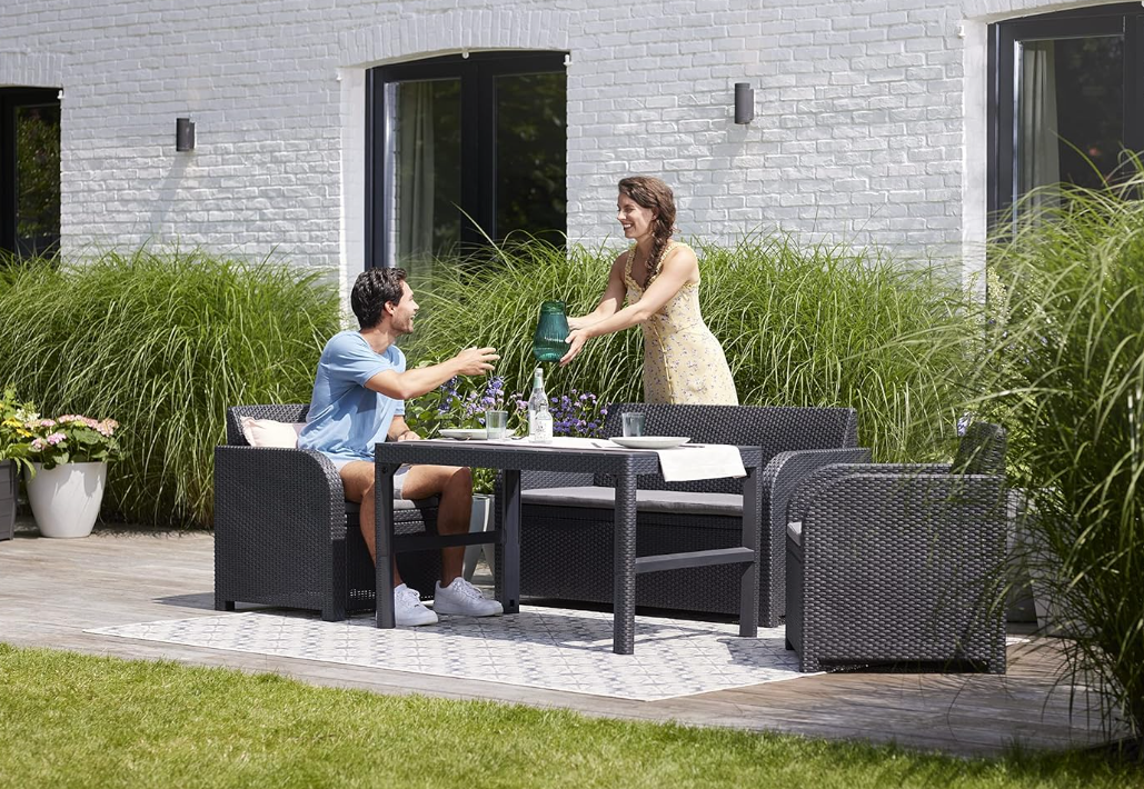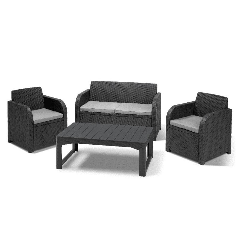 Souprava Carolina od značky Keter se skládá z pohovky, dvou křesel a výklopného konferenčního stolku s povrchovou úpravou z pryskyřice s imitací dřeva.