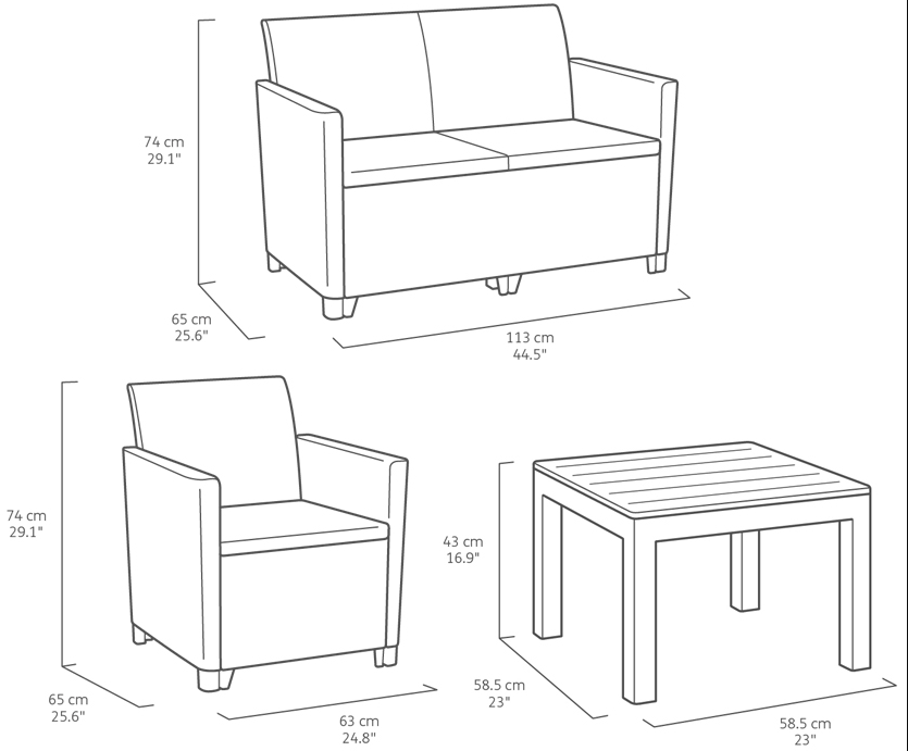 Přibližné rozměry jsou: pohovka 113x65x74 cm, křesla 63x65x74 cm, konferenční stolek 58,5x58,5x43 cm.