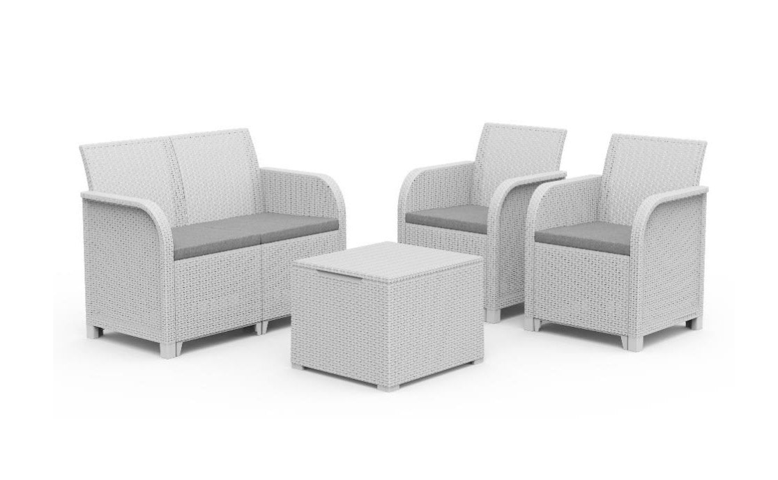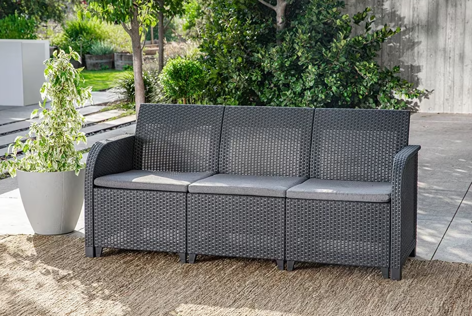 Souprava Rosalie od značky Keter zahrnuje pohovku, křesla a úložný stolek, vše vyrobené z tkané ratanové pryskyřice, odolné vůči povětrnostním vlivům, UV záření a snadno se čistí.