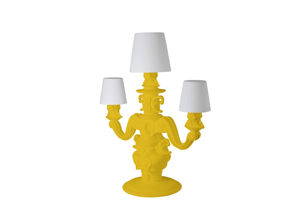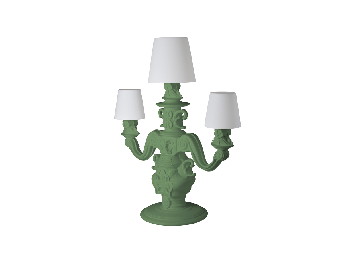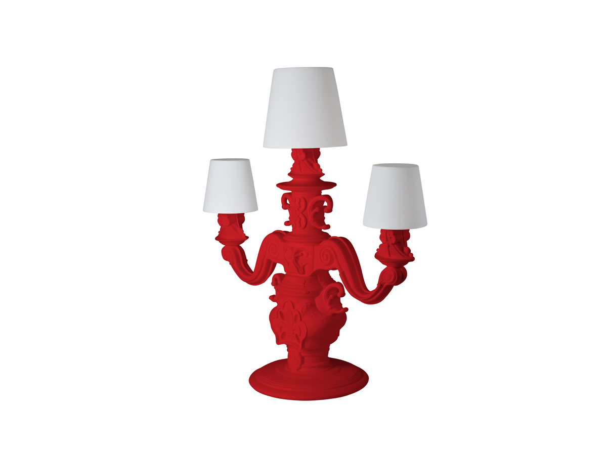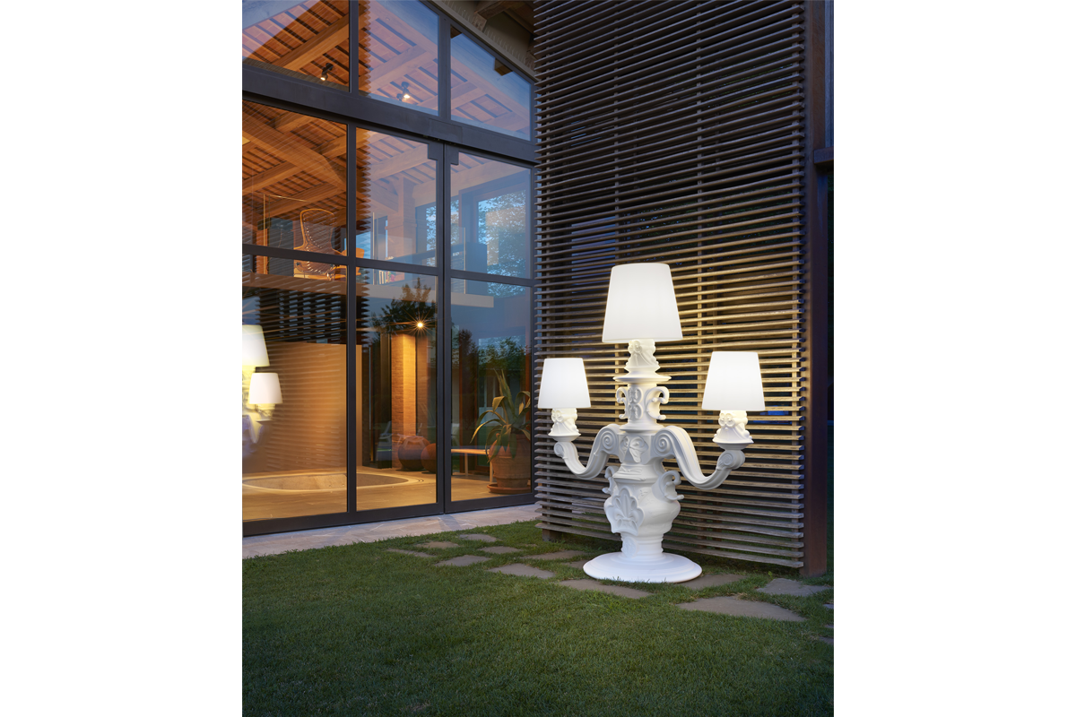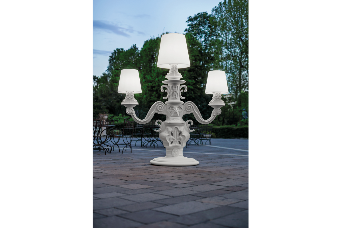 Stojací lampa King of Love, navržená Grazianem Morem a Renatem Pigattim, je součástí kolekce Design of Love. Podstavec lampy je v barokním stylu, zatímco tři velká, zářivě bílá stínidla jsou majestátní svými rozměry a vyznačují se inovativním detailem: polyethylen je ošetřen jedinečnou povrchovou úpravou s texturovaným klasickým motivem, která vytváří rafinovanou, elegantní a hmatovou dekoraci.