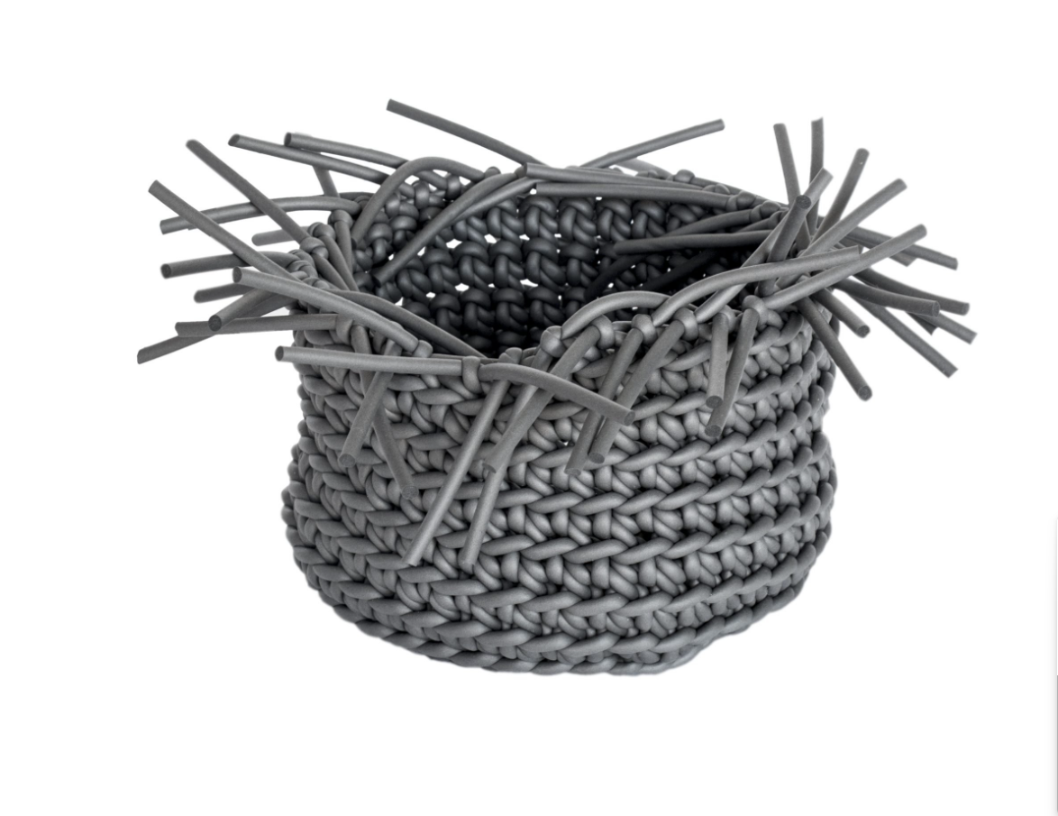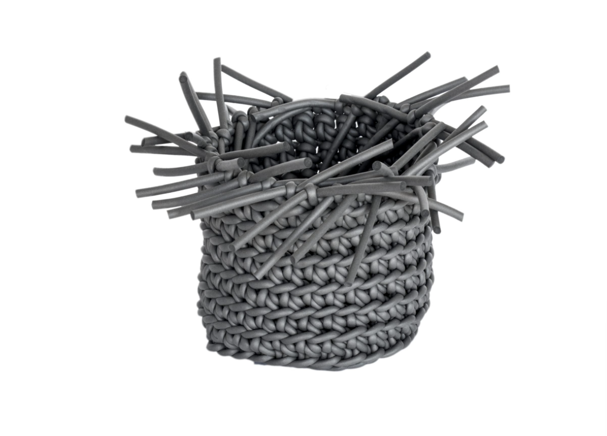Košík Dikobraz je ručně háčkovaný z tenké neoprenové příze, což mu dodává jemnou, ale zároveň odolnou strukturu.