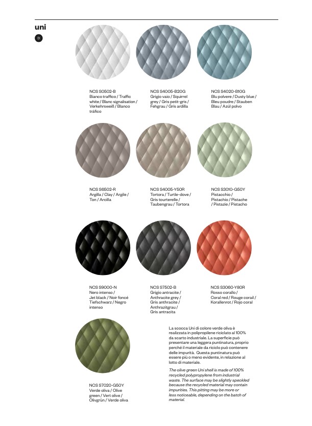 Je výškově nastavitelná a otočná, k dispozici v devíti barvách: kombinuje texturovaný sedák s prošívaným efektem z lisovaného polypropylenu a robustní, pevný pětiramenný ocelový rám, který je velmi stabilní.