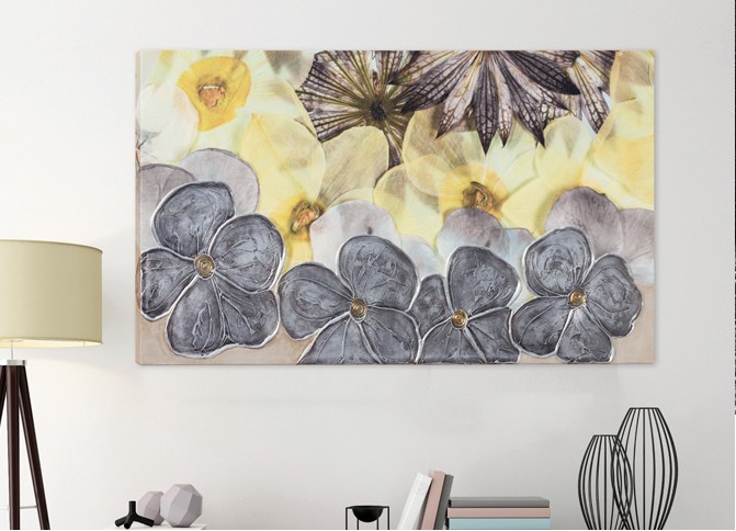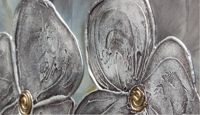 Plátěná struktura s texturovanými okvětními lístky, ručně zdobená stříbrnými listy.