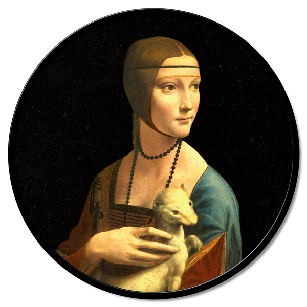 Kulatý panel z dřevěných vláken potažený čistým bavlněným plátnem s potiskem ve vysokém rozlišení a s matně lakovaným kovovým rámem.