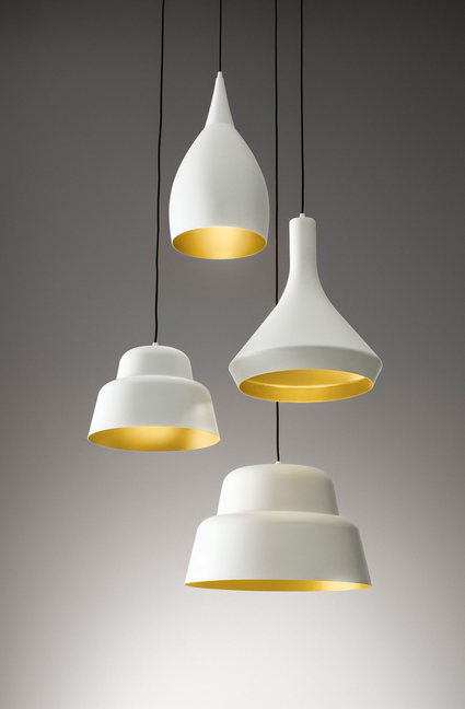Série závěsných lamp s měkkými a všestrannými tvary, vyrobených ze smaltovaného hliníku.