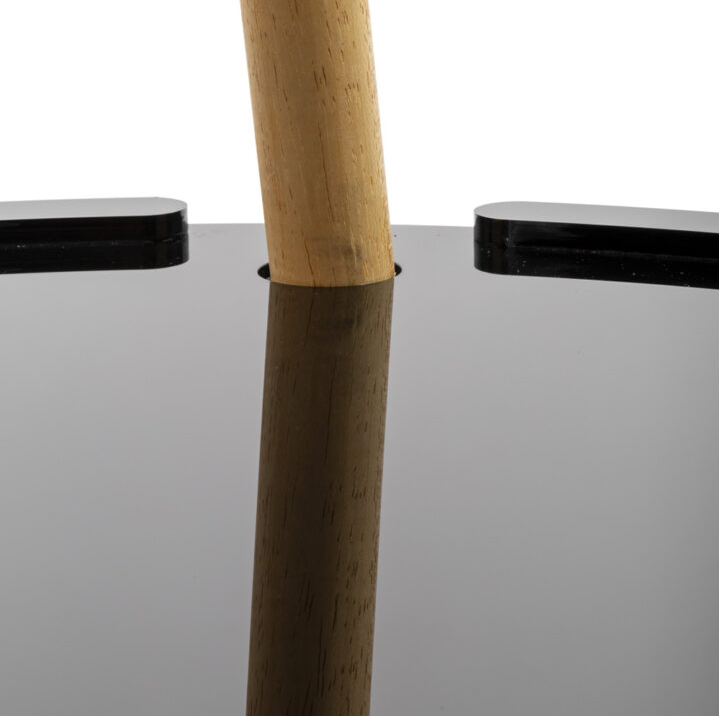 Konstrukce kombinuje dřevo a kov, zatímco stínidlo je vyrobeno z polypropylenu.