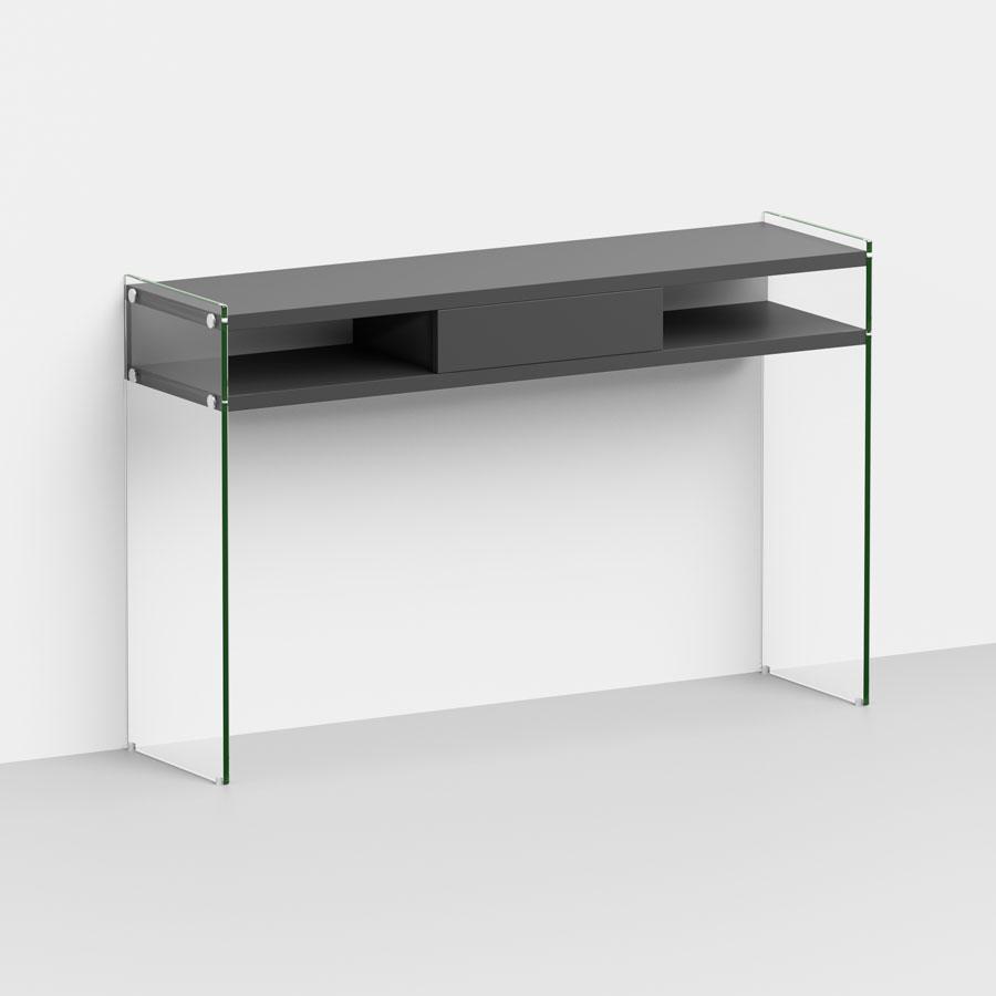 Konzolový stolek Maya se zásuvkou, vyrobený z 25mm ekologického laminátu pro vrchní desku a 18mm pro korpus, s 10mm silnými boky z tvrzeného skla.