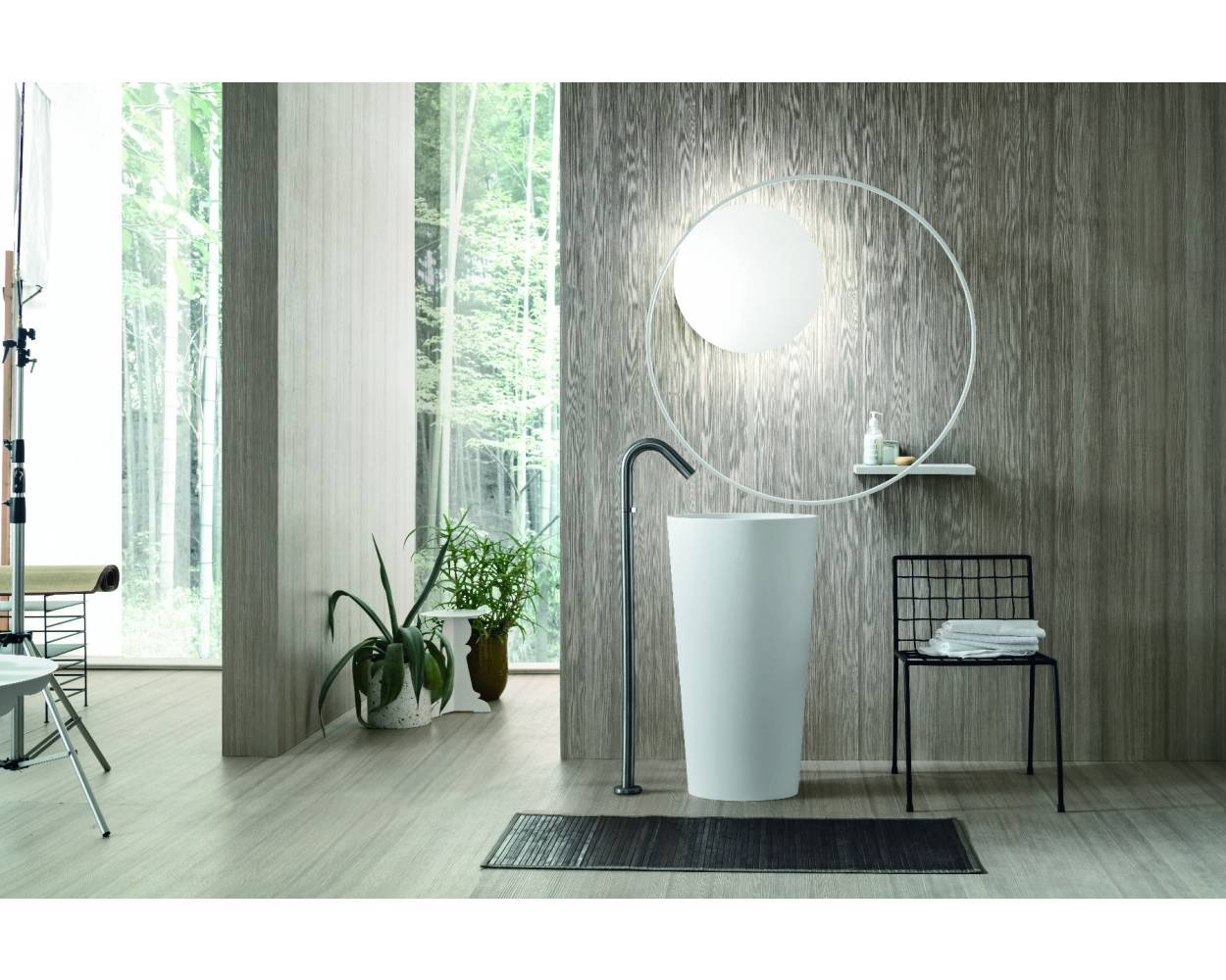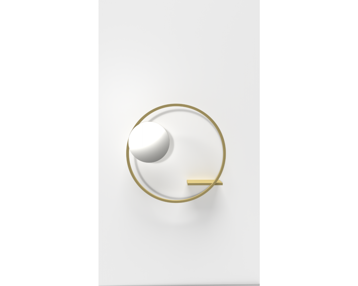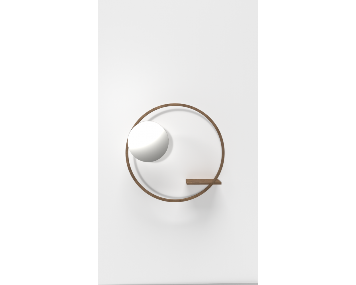 Rozměry: Prsten: ø 110 cm. Polička: 39,5 x 19,5 cm. Š: 21,5 cm. Velikost zrcadla: ø 50 cm