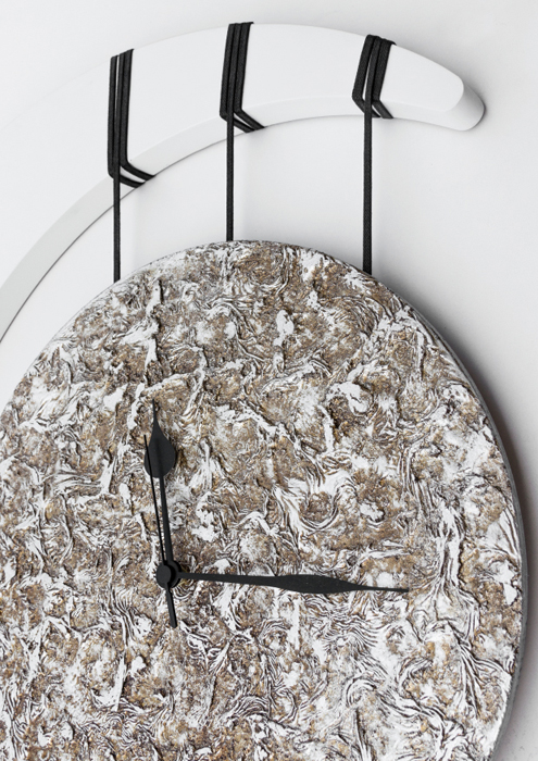 Tvarované hodiny, lakované ve slonovinové barvě, ručně zdobené stříbrnými lístky na materiálu, prvek zavěšený na šňůrkách.