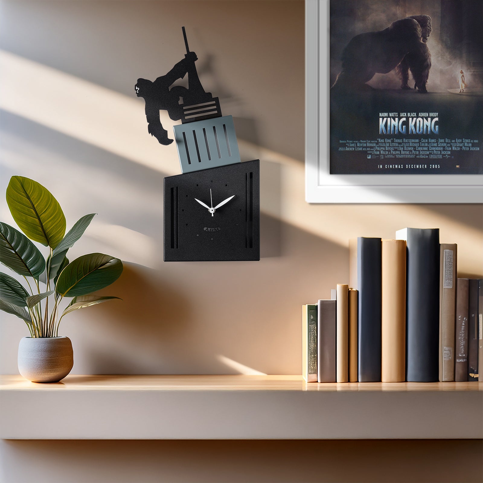 Slavná gorila je zobrazena, jak šplhá na vrchol budovy, což je gesto, které zachycuje veškeré napětí a sílu původní filmové scény. Odvážné a působivé grafické řešení, které proměňuje hodiny ve skutečnou nástěnnou sochu.