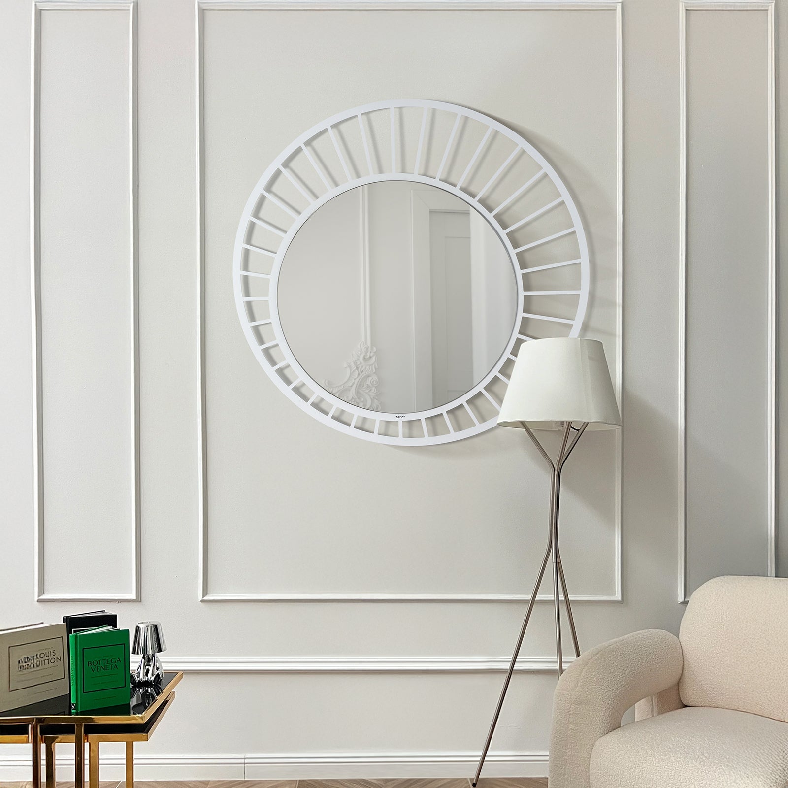 S průměrem 90 cm je zrcadlo Ray úžasným doplňkem každé stěny: v předsíni, obývacím pokoji, nad konzolovým stolkem nebo v ložnici. Jeho výrazná přítomnost je nepopiratelná, a přesto si zachovává jednoduchou a rafinovanou eleganci. Toto zrcadlo je k dispozici ve čtyřech všestranných a trendy barvách – černé, bahenní, mramorově bílé a béžové – a hodí se k různým stylům interiéru, od světlých a přírodních až po výrazné a moderní.