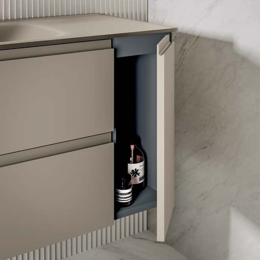 Kompozice Nettuno 128 od Oltrebagno je ideálním řešením pro ty, kteří hledají moderní, kompaktní a funkční koupelnový nábytek. Závěsná skříňka disponuje velkými zásuvkami s mechanismem tlumeného dovírání , který zajišťuje tiché a bezpečné zavírání a vytváří tak uklizené a pohodlné prostředí.