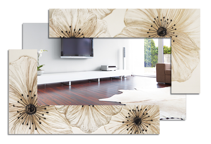 ZRCADLO 120x80 cm (zrcadlo 100x44 cm) SLONOVINOVÁ varianta Ručně zdobená květinová kompozice s pryskyřičnými detaily na texturovaném materiálu, dělená konstrukce s konzolovým zrcadlem, horizontální/vertikální montáž, extra lesklý povrch.