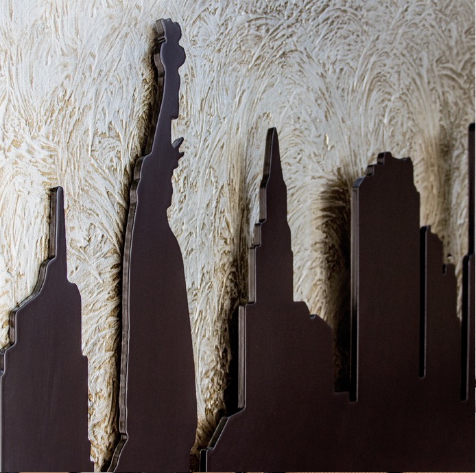 Tvarovaný reliéfní prvek lakovaný v kávové barvě na struktuře ručně zdobené stříbrnými lístky na materiálu, lesklá povrchová úprava.