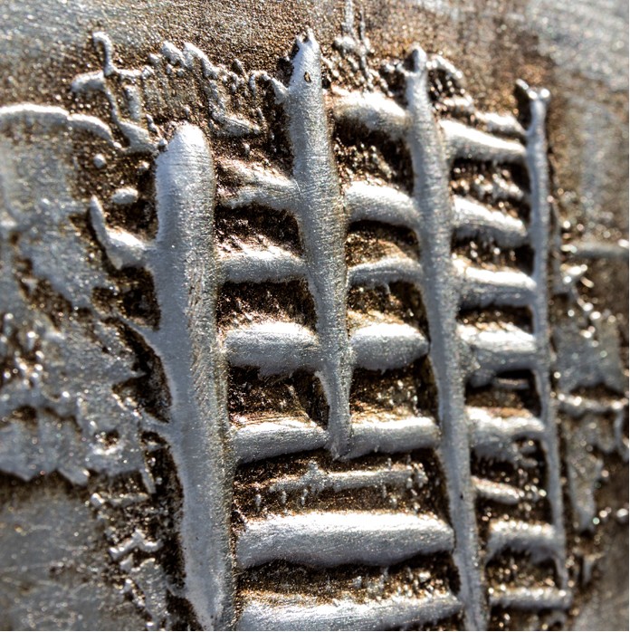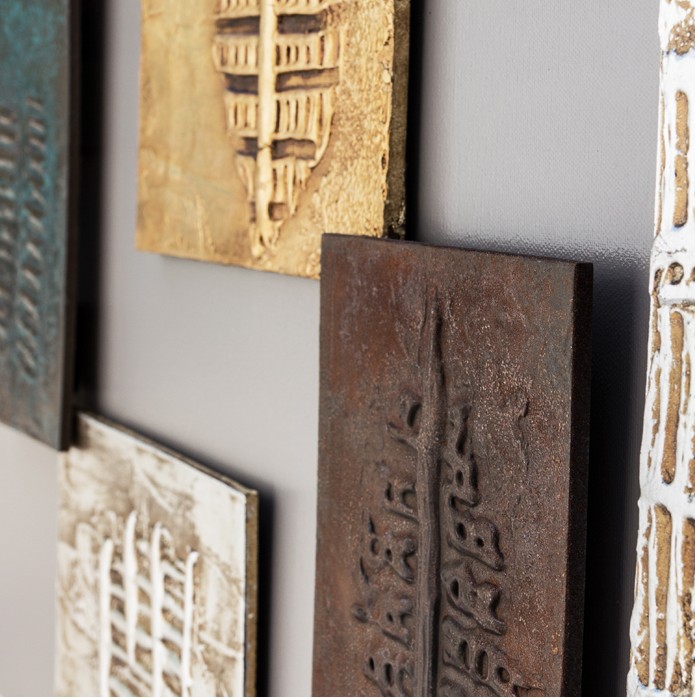 Osm překrývajících se materiálových prvků ručně zdobených zlatými, stříbrnými a kyselinou leptanými bronzovými povrchovými úpravami, efektem rzi, holubě šedou lakovanou plátěnou strukturou, lesklou povrchovou úpravou.