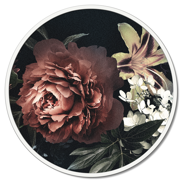 Kulatý panel z dřevěných vláken potažený čistým bavlněným plátnem s potiskem ve vysokém rozlišení a s matně lakovaným kovovým rámem.