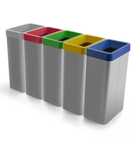 Koš na tříděný odpad s rámem a dnem z ocelového plechu o tloušťce 1 mm, natřený epoxidovými práškovými barvami ve stříbrnošedé nebo matně bílé barvě.