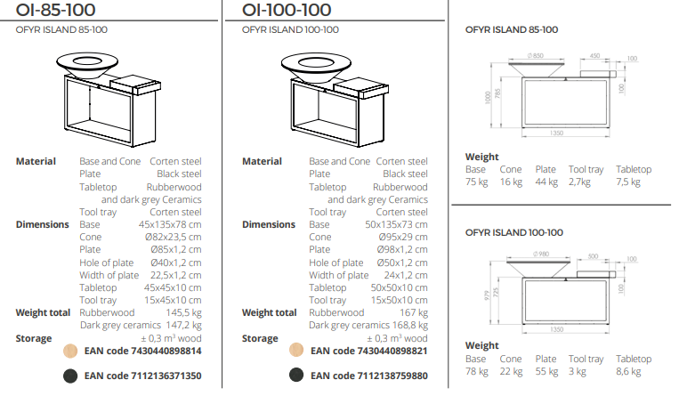 Tato víceúčelová jednotka kombinuje styl a jedinečnou funkčnost v kompaktním designu. Je vyrobena z odolné cortenové oceli a je k dispozici ve verzích o rozměrech 85 a 100 cm s držákem na palivové dříví, krájecím prkénkem z masivního dřeva a praktickým odkládacím tácem na náčiní a koření.