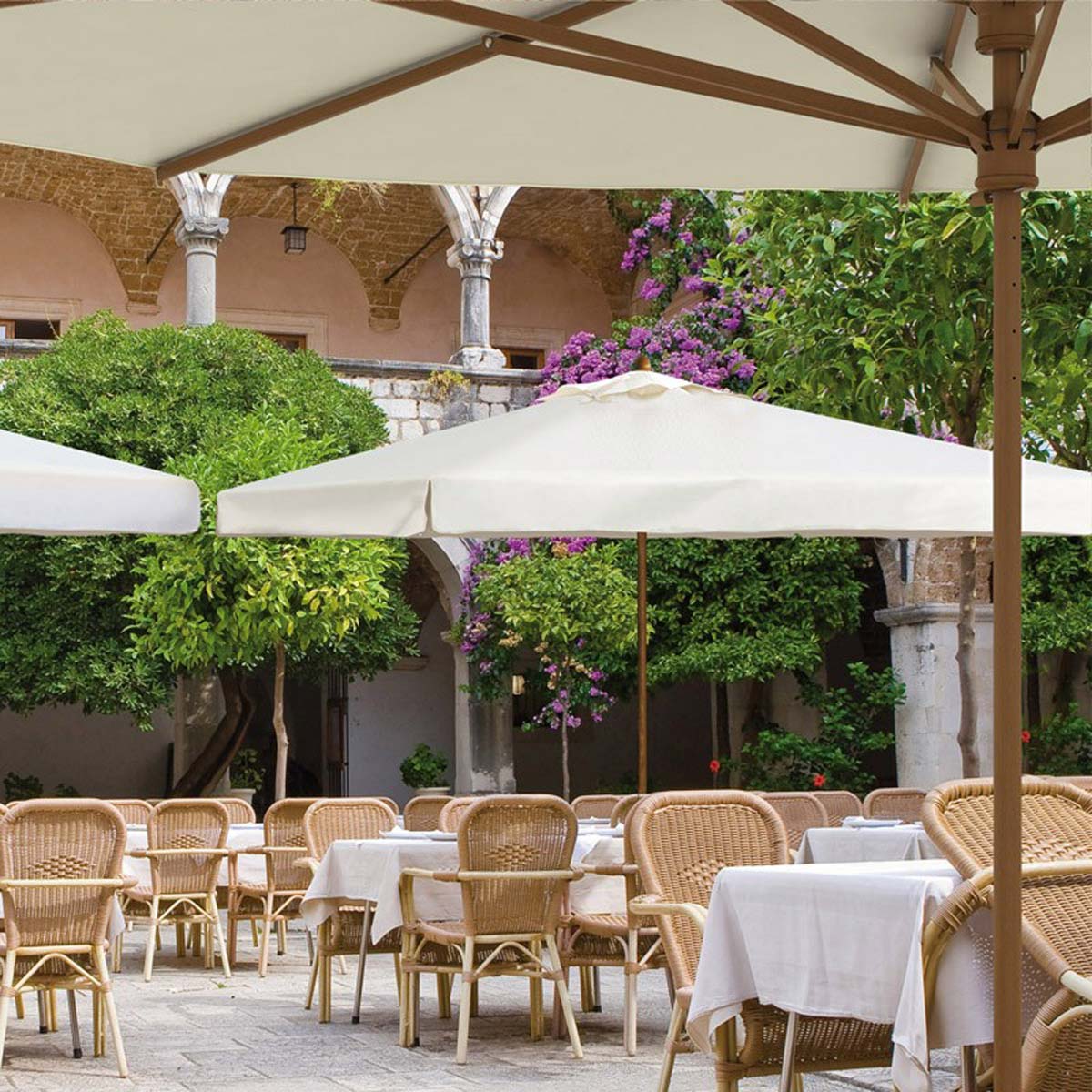 Teleskopický slunečník Palladio 3x4 od Scolaro Ombrelloni Parasol je zahradní slunečník s centrální tyčí a teleskopickým zavíráním, určený pro náročné a profesionální použití. Je to pevný a robustní deštník s rámem z irokového dřeva. Díky svému otevíracímu a zavíracímu mechanismu nad stoly a židlemi je ideálním slunečníkem do barů a restaurací. Teleskopická verze, kterou poprvé navrhla a vyvinula společnost Scolaro, nabízí snadné a funkční otevírání a zavírání nad stoly a židlemi.