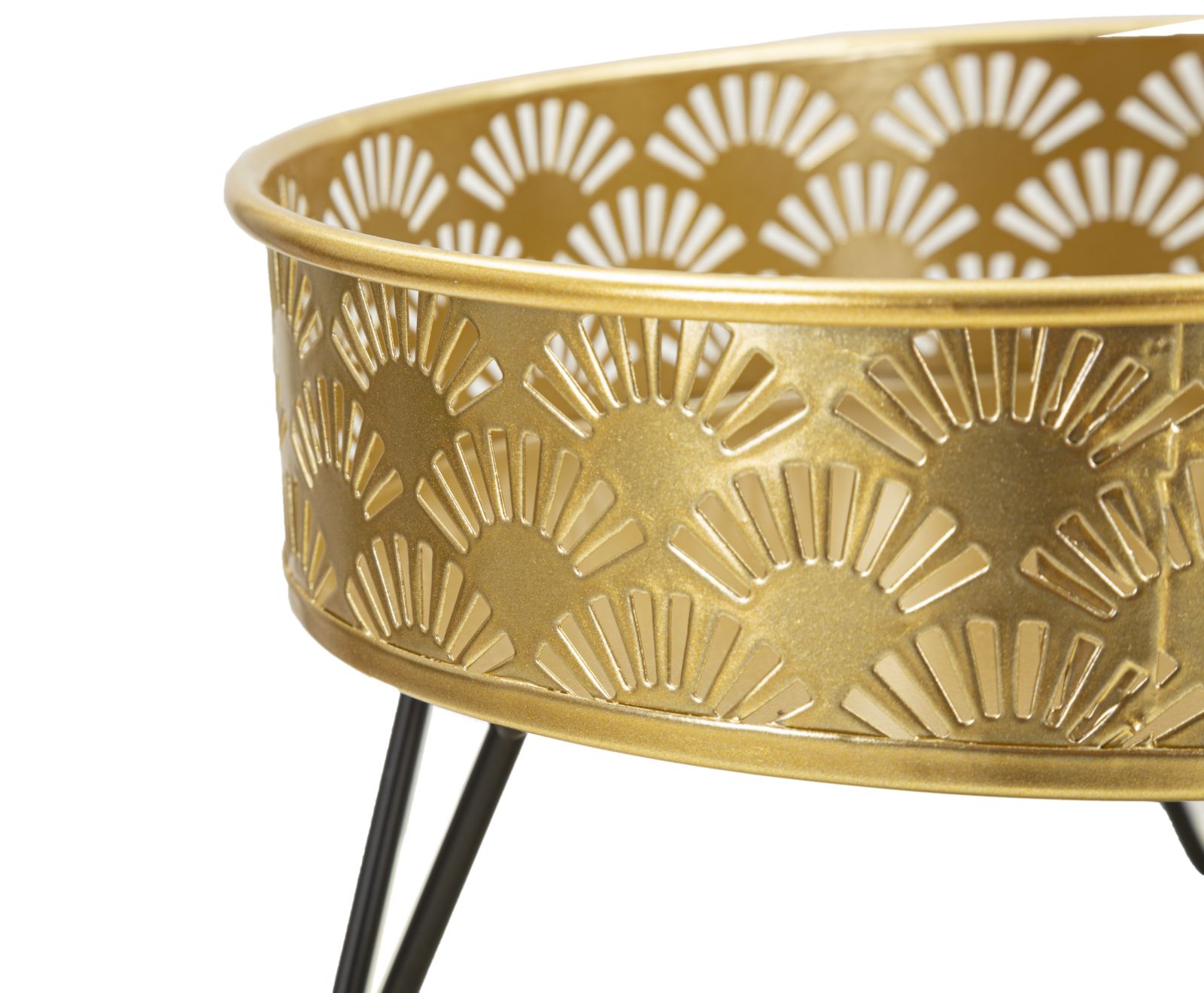 Dvojice pozlacených kovových květináčů elegantně zdobených pravidelnými geometrickými řezbami. Doplněny černými kovovými stojany. Květináče lze ze stojanů odejmout.