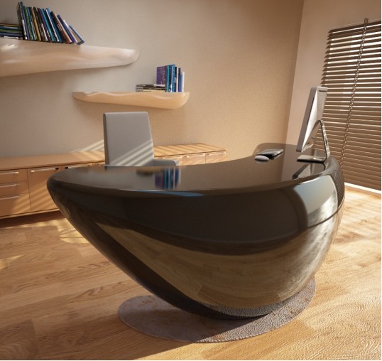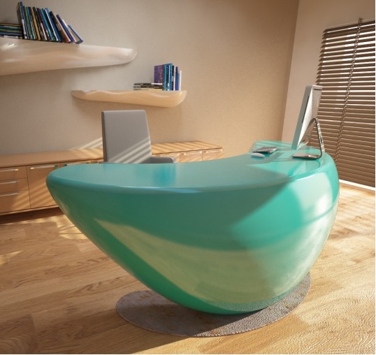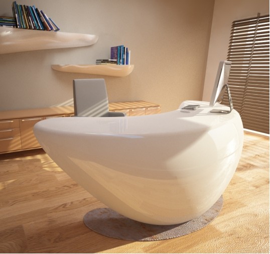Kancelářský stůl Boomerang je interpretován jako designový doplněk, kolem kterého lze zařídit zbytek místnosti.