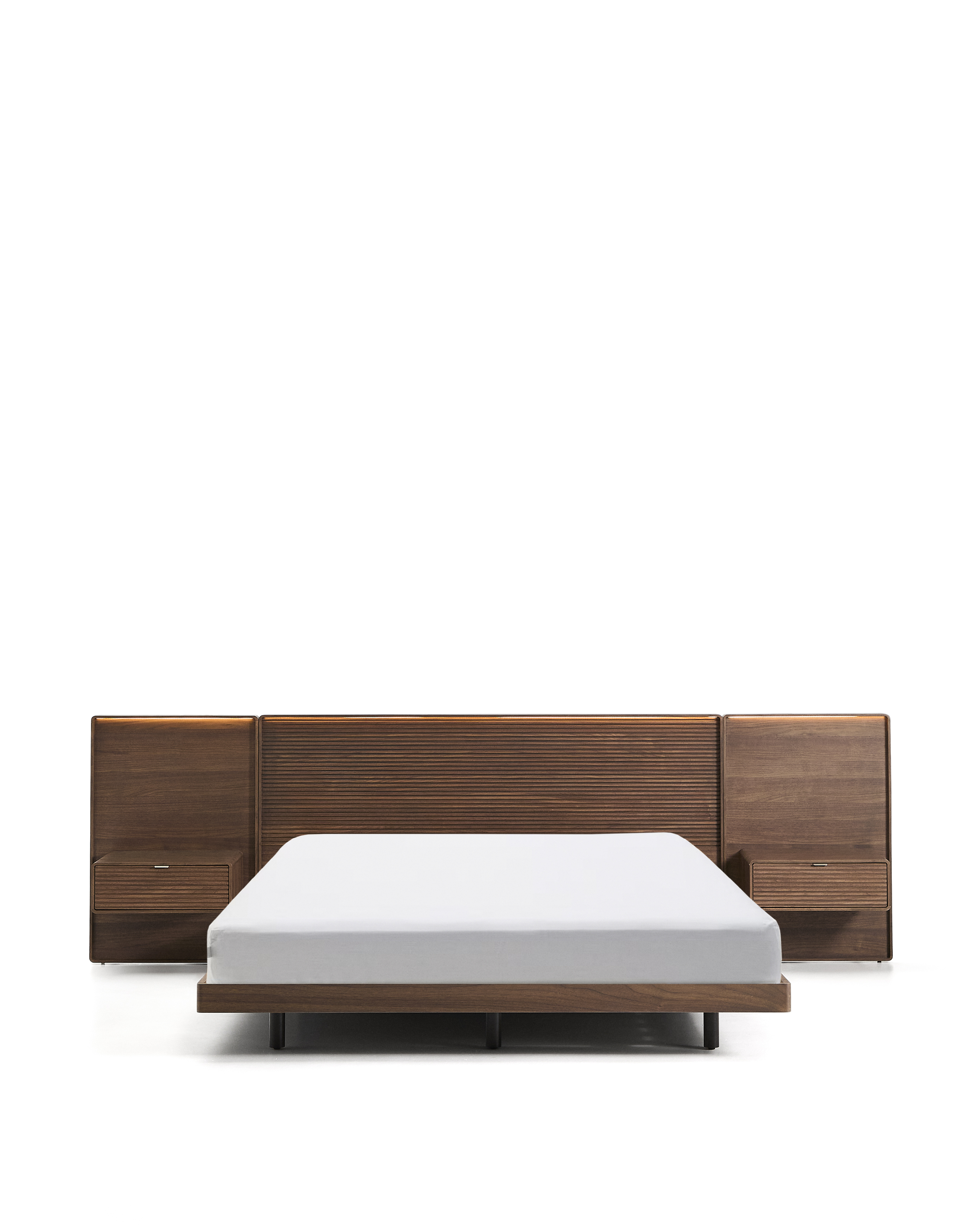 Norlen vzdává hold designu 50. let 20. století s moderním nádechem a kombinuje minimalistické formy s vintage detaily. Jemně zaoblené rohy a dřevěná podnož evokují nostalgický nádech, reinterpretovaný čistými liniemi a moderními proporcemi. Čelo postele z ořechové dýhy s jemným horizontálním lineárním frézováním dodává charakter a vizuální hloubku, zatímco integrovaný LED světelný pásek v horní části zaplavuje místnost osvětlením s teplotou 3000K, teplým, příjemným světlem s jemným nažloutlým odstínem, ideálním pro vytvoření útulné a příjemné atmosféry během odpočinku. Světlo se aktivuje dálkovým ovládáním. 1,5metrový kabel s přímým zapojením do zásuvky usnadňuje pohodlnou a všestrannou instalaci v jakémkoli prostoru. Pevný a robustní rošt postele je vyroben z 14lamelové březové překližky, která je navržena tak, aby poskytovala perfektní oporu a optimální odvětrávání matrace. Devět masivních březových nohou s elegantním kruhovým průřezem a vnějším profilem obloženým ořechovým dřevem zajišťuje maximální stabilitu a estetickou kontinuitu designu a v každém detailu spojuje krásu a funkčnost. Sadu doplňují dva dokonale integrované noční stolky, které jsou také vybaveny LED osvětlením pro vytvoření jednotné a obklopující atmosféry v celé ložnici. Každý noční stolek nabízí praktické úložné řešení se zásuvkou se skrytými výsuvy s funkcí tlumeného dovírání, která zajišťuje plynulé a tiché otevírání a zavírání. Úchytky jsou z kartáčované nerezové oceli se saténovou povrchovou úpravou, která snižuje viditelnost otisků prstů a škrábanců a je vysoce odolná vůči korozi. Zkosený design navíc usnadňuje uchopení při otevírání dvířek. Dřevo s certifikací FSC Mix Credit, vyrobené ze směsi materiálů z lesů s certifikací FSC a dřeva kontrolovaného FSC. Tento návrh je ideální volbou pro ty, kteří hledají v ložnici dokonalou rovnováhu mezi sofistikovaným designem, technickými inovacemi a maximálním pohodlím.