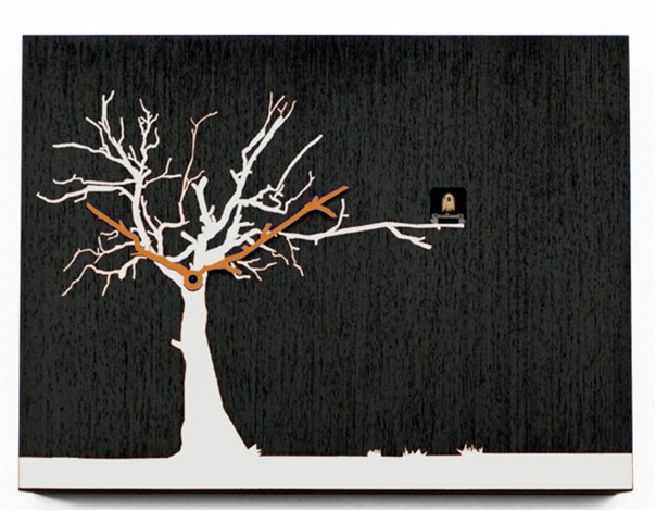 Jednoduchý, jemný, lineární, a přesto působivý, obraz s několika prvky, který vyniká. Toto je CùCùRùKù, designový objekt, jeden z bestsellerů studia Progetti, vytvořený Riccardem Paolinem a Matteem Fusim, ceněný pro svou decentní eleganci. CùCùRùKù je poctou přírodě, zejména podzimnímu a zimnímu období, kdy stromy ztrácejí listí, dřevo se dostává do popředí a převládají teplé, pak studené barvy sněhu. Kukačka sedí na nejdelší větvi, chráněná před nepřízní počasí. Ručičky, tvarované jako větve, jsou k dispozici v oranžové, bílé nebo zelené barvě. Quartzový strojek napájený z baterie. Světlocitlivý senzor automaticky zastaví zvonění při absenci světla.