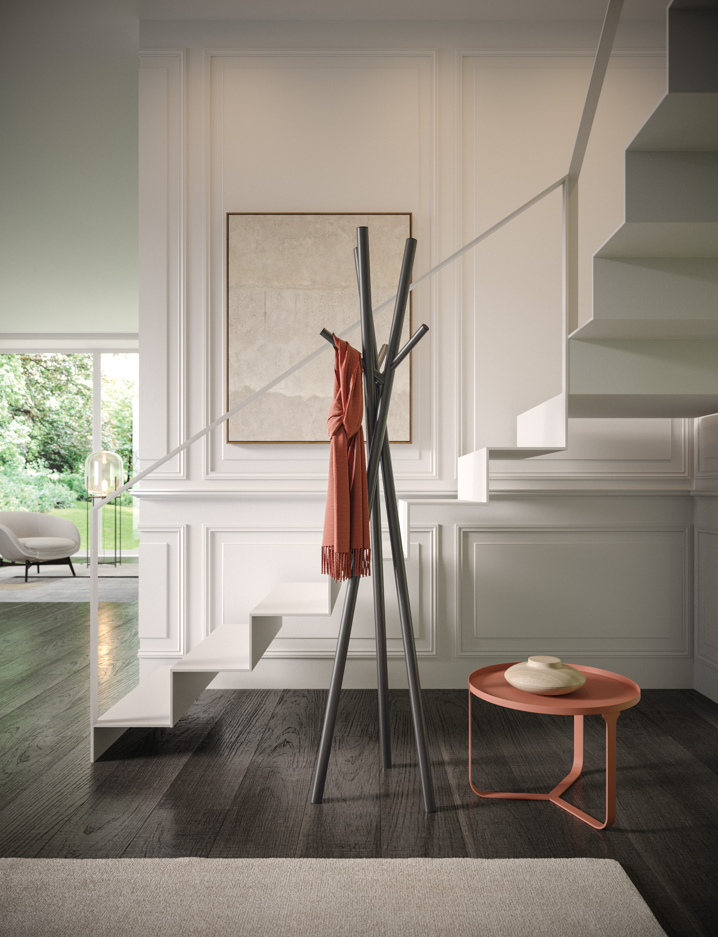 Elegantní kovový věšák na kabáty kombinuje funkčnost a moderní design. Díky třem hlavním tyčím, které se táhnou jako větve stromů, nabízí další závěsné body pro uspořádání oblečení, bund, tašek a doplňků organizovaným a stylovým způsobem. Jeho kompaktní konstrukce se perfektně hodí do jakéhokoli prostoru, od vstupní haly až po ložnici nebo kancelář, aniž by obětovala praktičnost. STICK nejen nabízí úložná řešení, ale také dodává moderní nádech svými čistými, minimalistickými liniemi, inspirovanými přírodní krásou stromů. Proměňte svůj prostor funkčností a stylem se STICK.