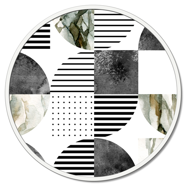 Kulatý panel z dřevěných vláken potažený čistým bavlněným plátnem s potiskem ve vysokém rozlišení a s matně lakovaným kovovým rámem.