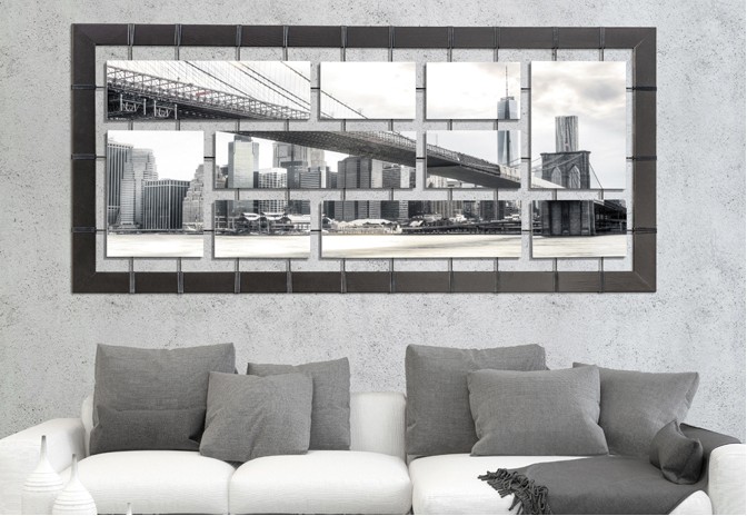 Dřevěný rám v kávově lakované barvě s deseti ručně zdobenými panely, zavěšený na lanech.