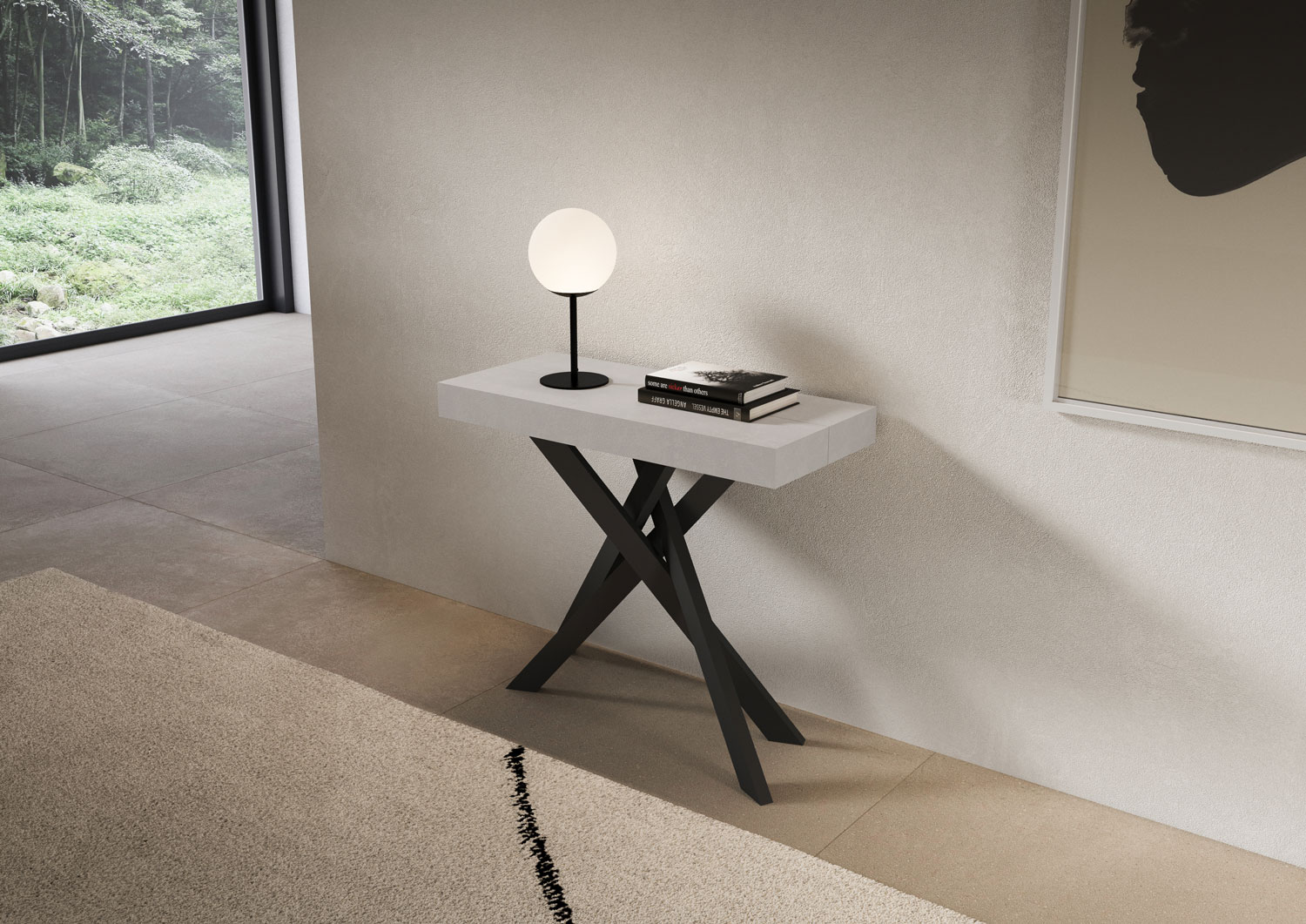 Rozkládací konzolový stolek Saki Premium, všestranný a robustní, perfektní doplněk do jakékoli místnosti v domě: vstupní haly, kuchyně, jídelny, obývacího pokoje nebo chodby. Rozkládací konzolový stolek Saki Premium lze snadno přeměnit na velký jídelní stůl o délce až 300 cm, pro který je možné sedět 14 osob. Vyroben z melaminových panelů a železných nohou, vrchní deska a prodloužení jsou opracovány skládacím zpracováním. Rozkládací systém s teleskopickými hliníkovými vodítky a dodané boční podpěry činí konzolový stolek stabilním a robustním. Po složení konzole je nutné prodloužení uskladnit jinde. Produkt Itamoby Vyrobeno v Itálii Rozměry: Složená konzola: Š. 90 H. 40 V. 77 cm Délka s 1 prodloužením: 92 cm Délka se 2 prodlouženími: 144 cm Délka se 3 prodlouženími: 196 cm Délka se 4 prodlouženími: 248 cm Délka s 5 prodlouženími: 300 cm