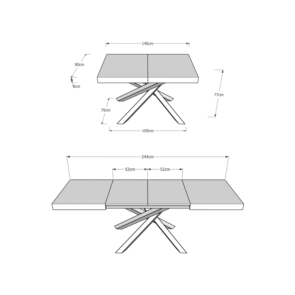 Rozkládací stůl Volantis o délce 140 cm se svým sofistikovaným moderním designem se přizpůsobí jakémukoli interiéru a je ideální volbou jak jako jídelní stůl, tak i jako kus nábytku do obývacího pokoje, kde můžete stylově přivítat hosty. Rozkládací stůl Volantis lze postupně rozložit až na 244 cm, což pojme 12 osob. Je vyroben z melaminových panelů, železných nohou a skládací desky. Systém rozkládání s hliníkovými teleskopickými vodítky činí stůl stabilním a robustním i v plném rozložení, bez nutnosti dalších podpěr. Rozkládací části jsou okamžitě připraveny k použití, protože jsou umístěny pod hlavní deskou stolu. Itamoby Vyrobeno v Itálii Rozměry: Složený stůl: Š 140 H 90 V 77 cm Délka s 1 rozkládací částí: 192 cm Délka se 2 rozkládacími částmi: 244 cm