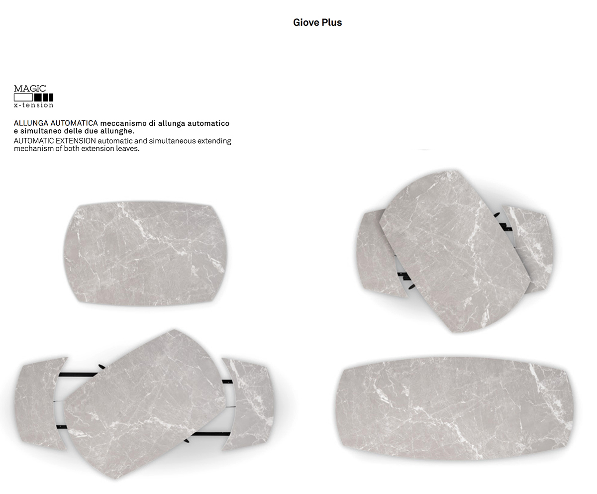Stůl Giove Plus od Connubia je designový rozkládací stůl , který kombinuje eleganci, funkčnost a inovaci. Díky automatickému otevíracímu mechanismu se horní deska plynule a intuitivně rozkládá: jednoduchým otočením se během několika sekund rozloží větší deska stolu, ideální pro posezení s přáteli a rodinou.