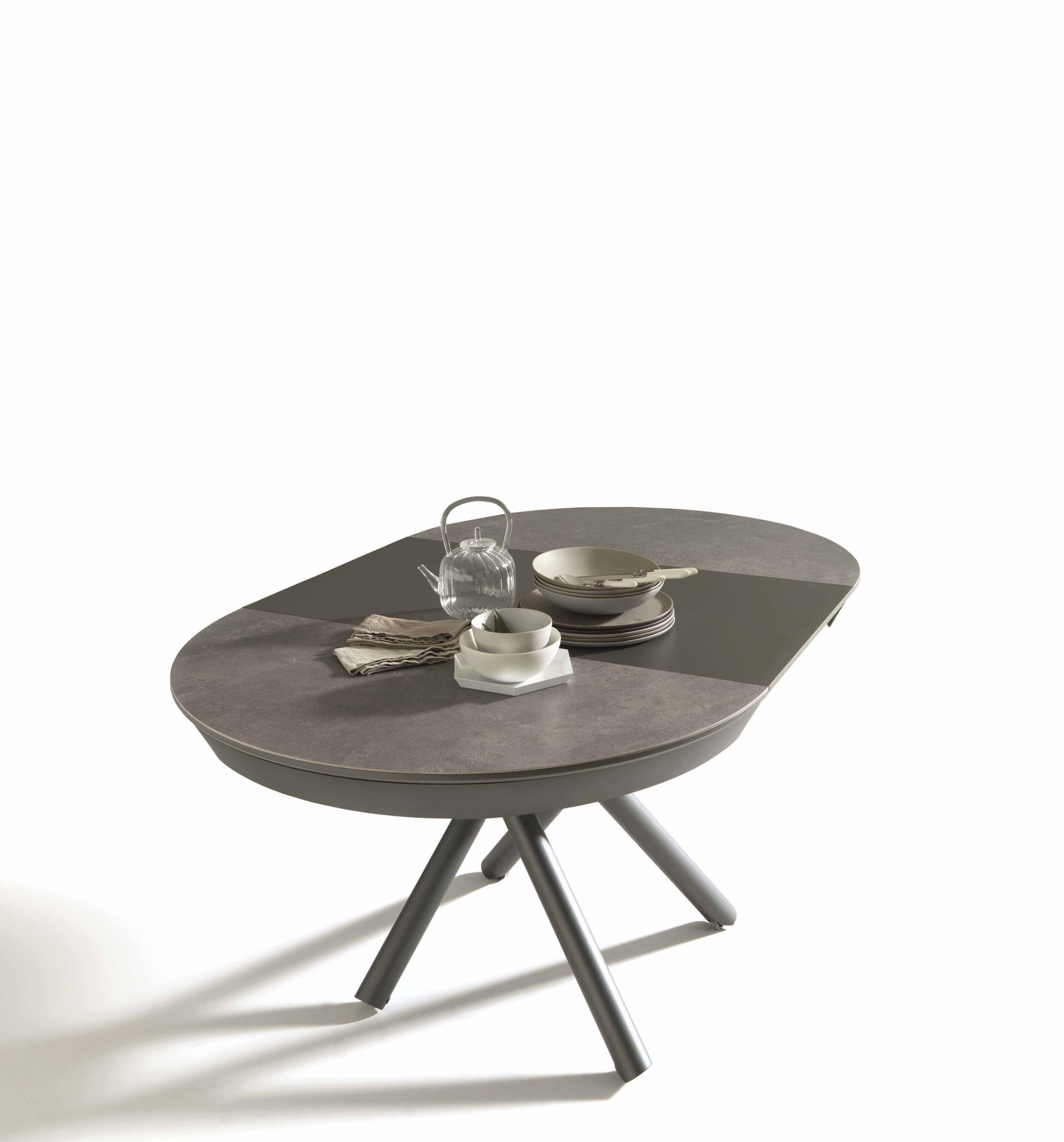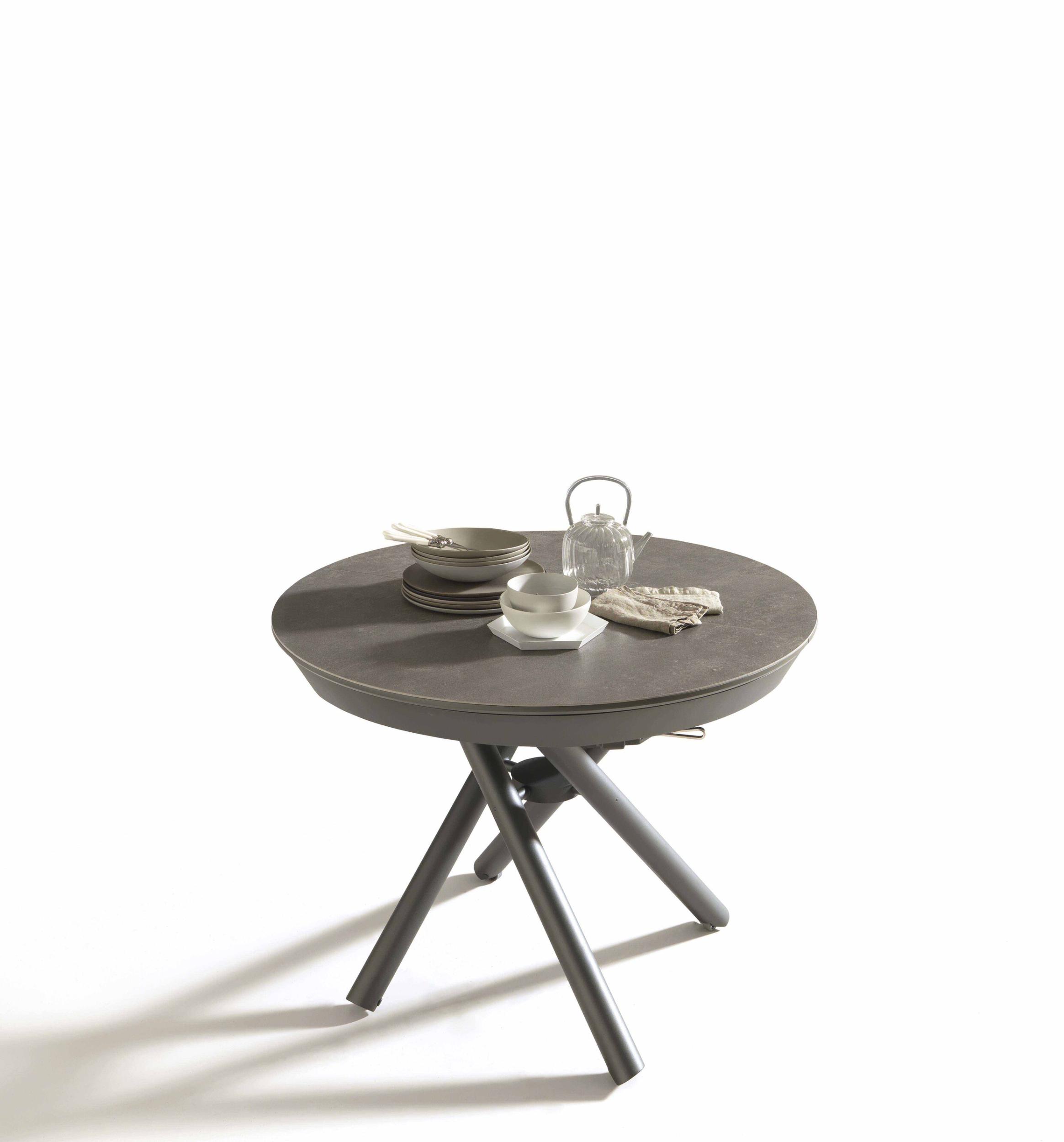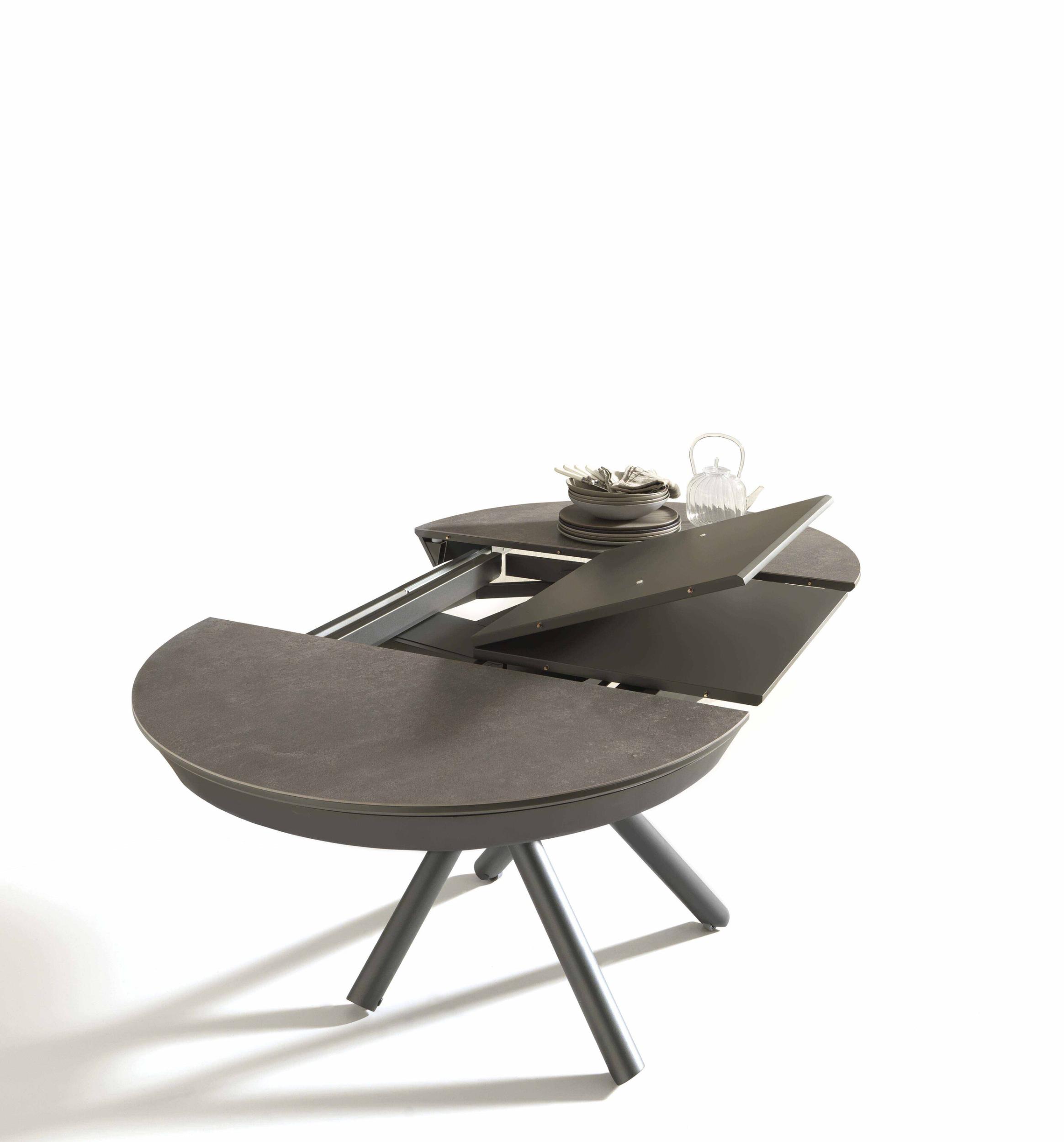 Kulatá deska z melaminu, dřeva, skla, maltového efektu a keramiky, vnitřní skládací výsuv, ideální do každého prostředí.