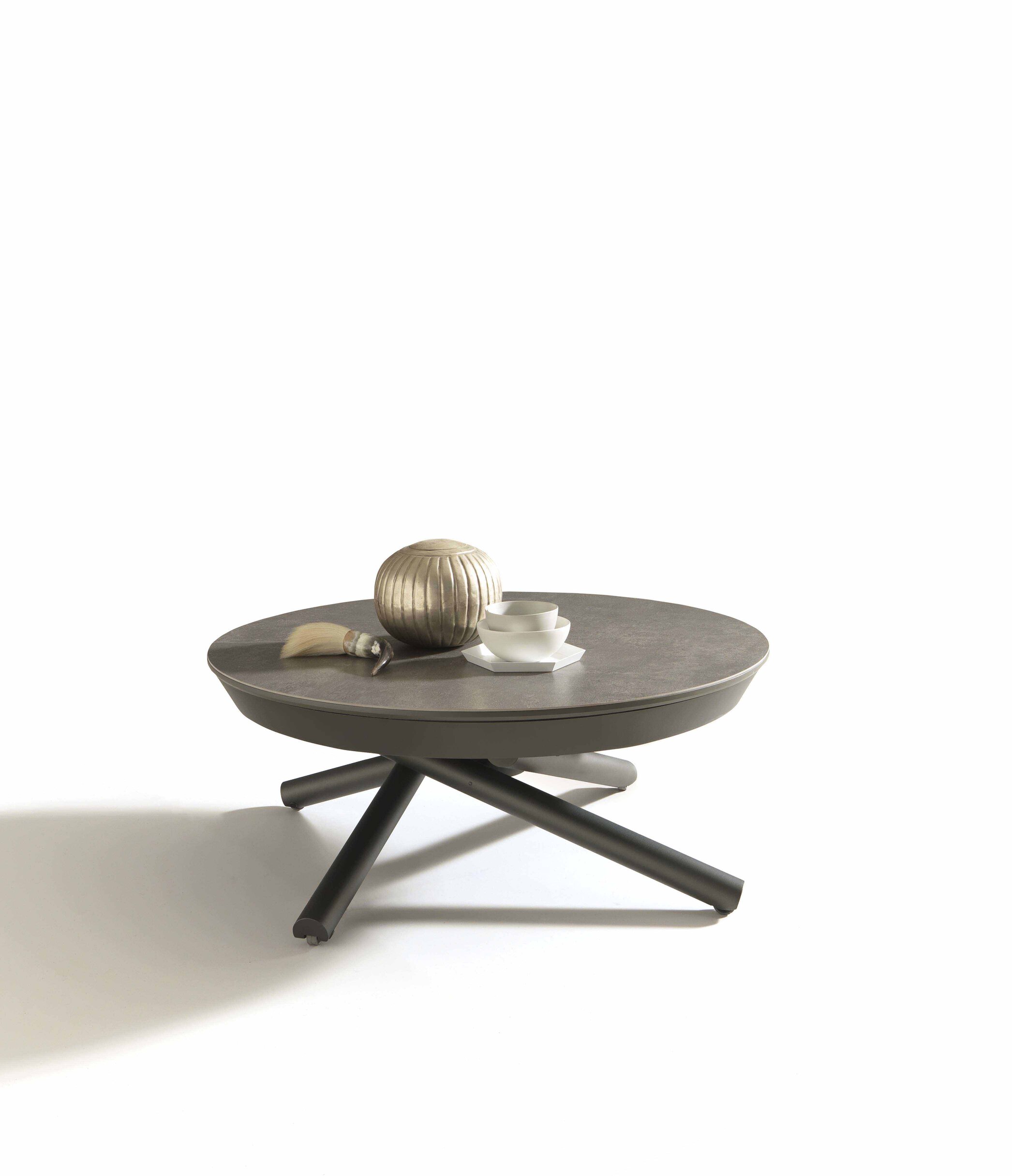 Všestranný stůl, který se snadno promění z konferenčního stolku na jídelní stůl, je vybaven plynovým mechanismem s milimetrově přesnou výškou od 36 cm do 75 cm.